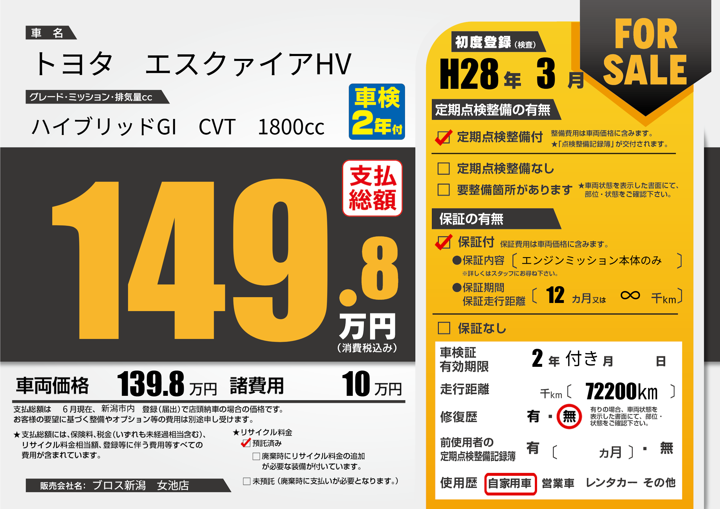 | 走行キロ | - | 初年度登録 | H28年3月 |
