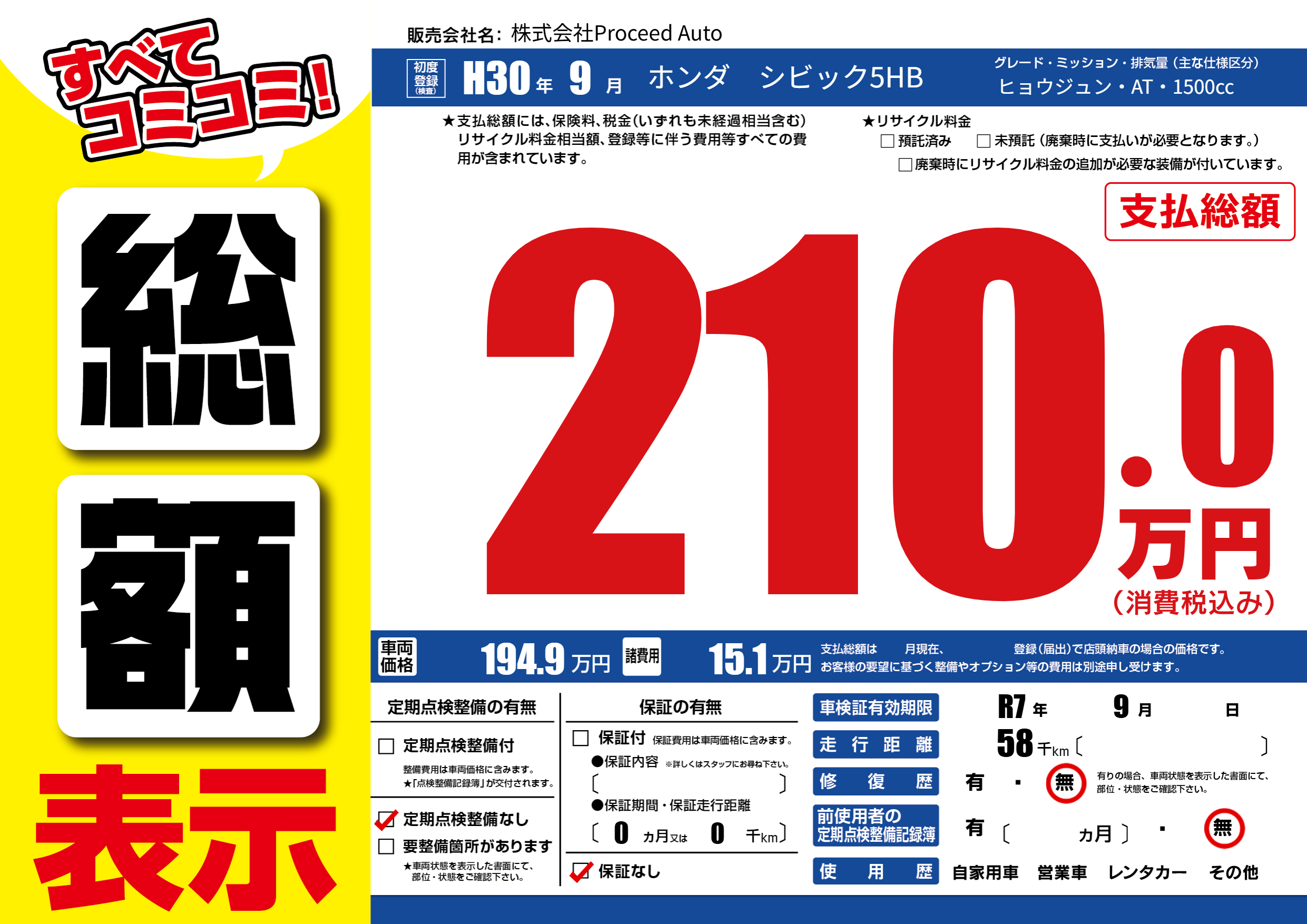 | 車名 | ホンダ シビック5HB | グレード ミッション 排気量 |