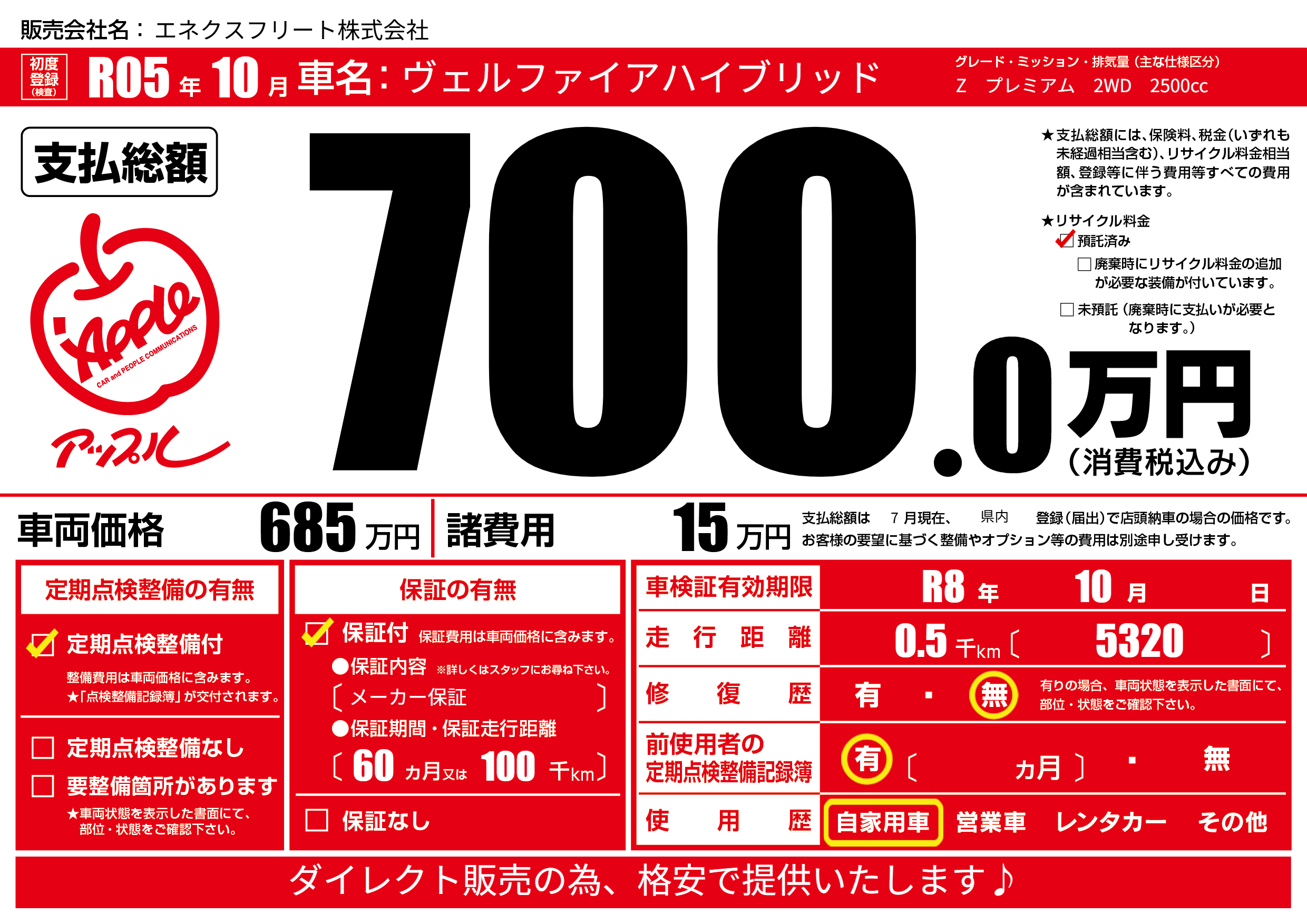 | 走行キロ | - | 初年度登録 | R05年10月 |
