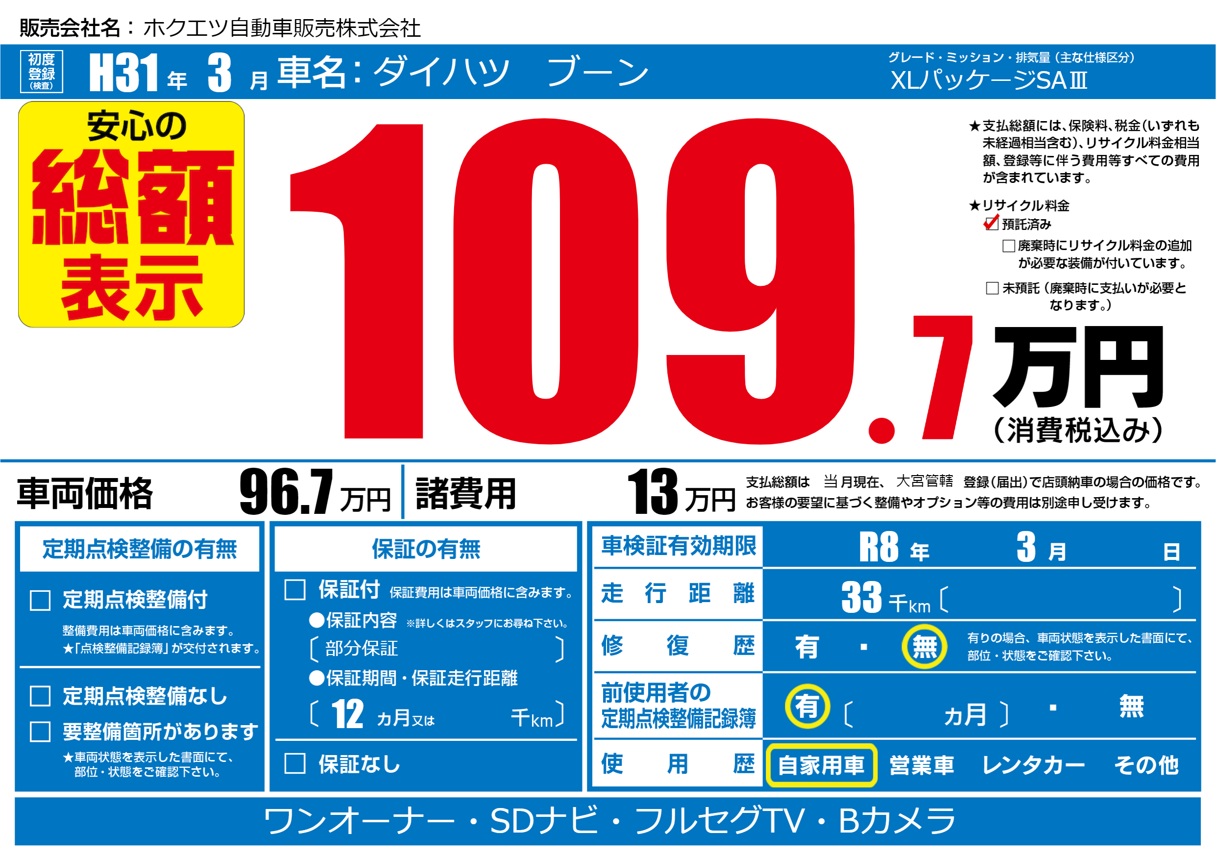 | 車名 | ダイハツ ブーン | グレード ミッション 排気量 |