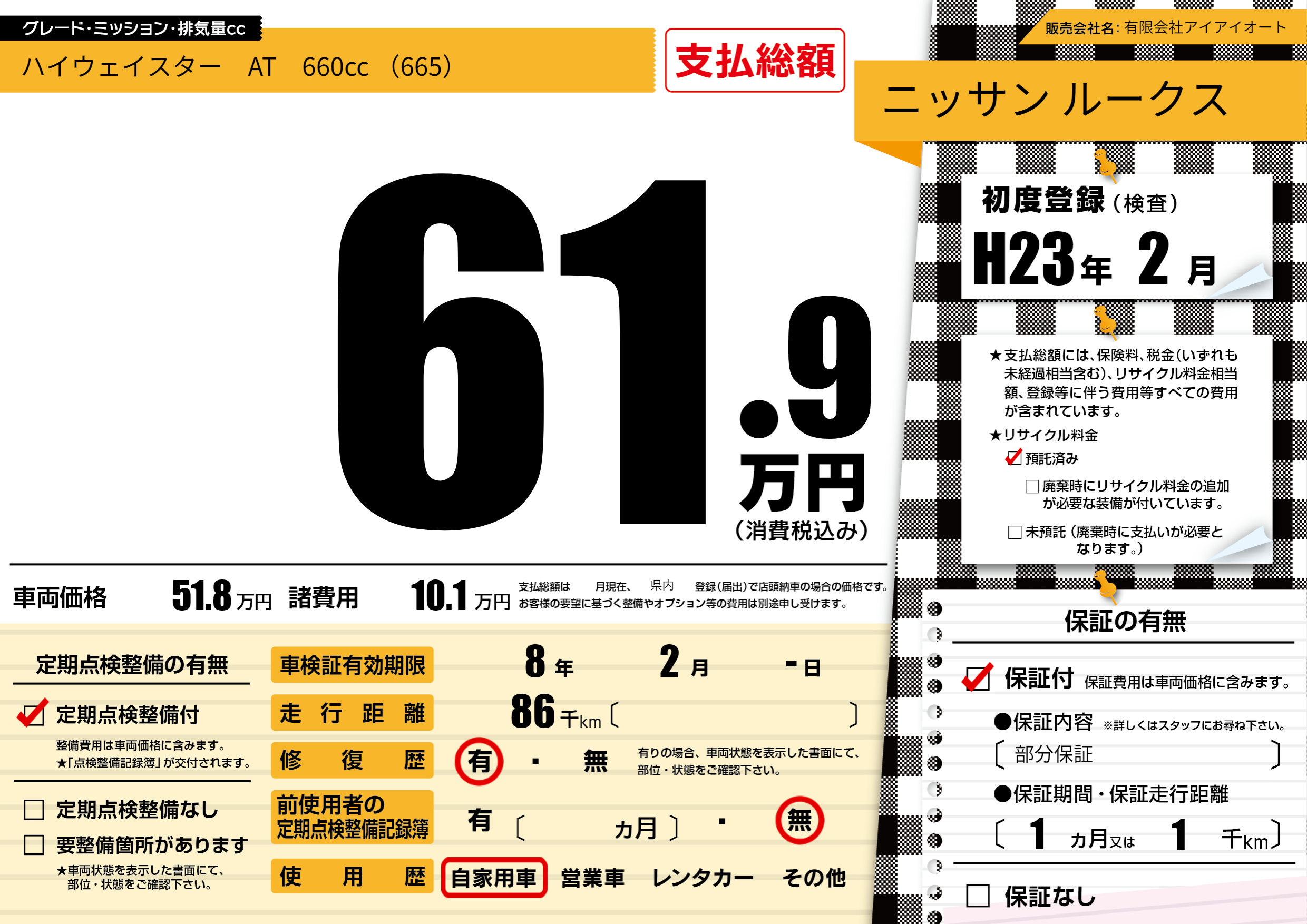 | 車名 | ニッサン ルークス | グレード ミッション 排気量 |