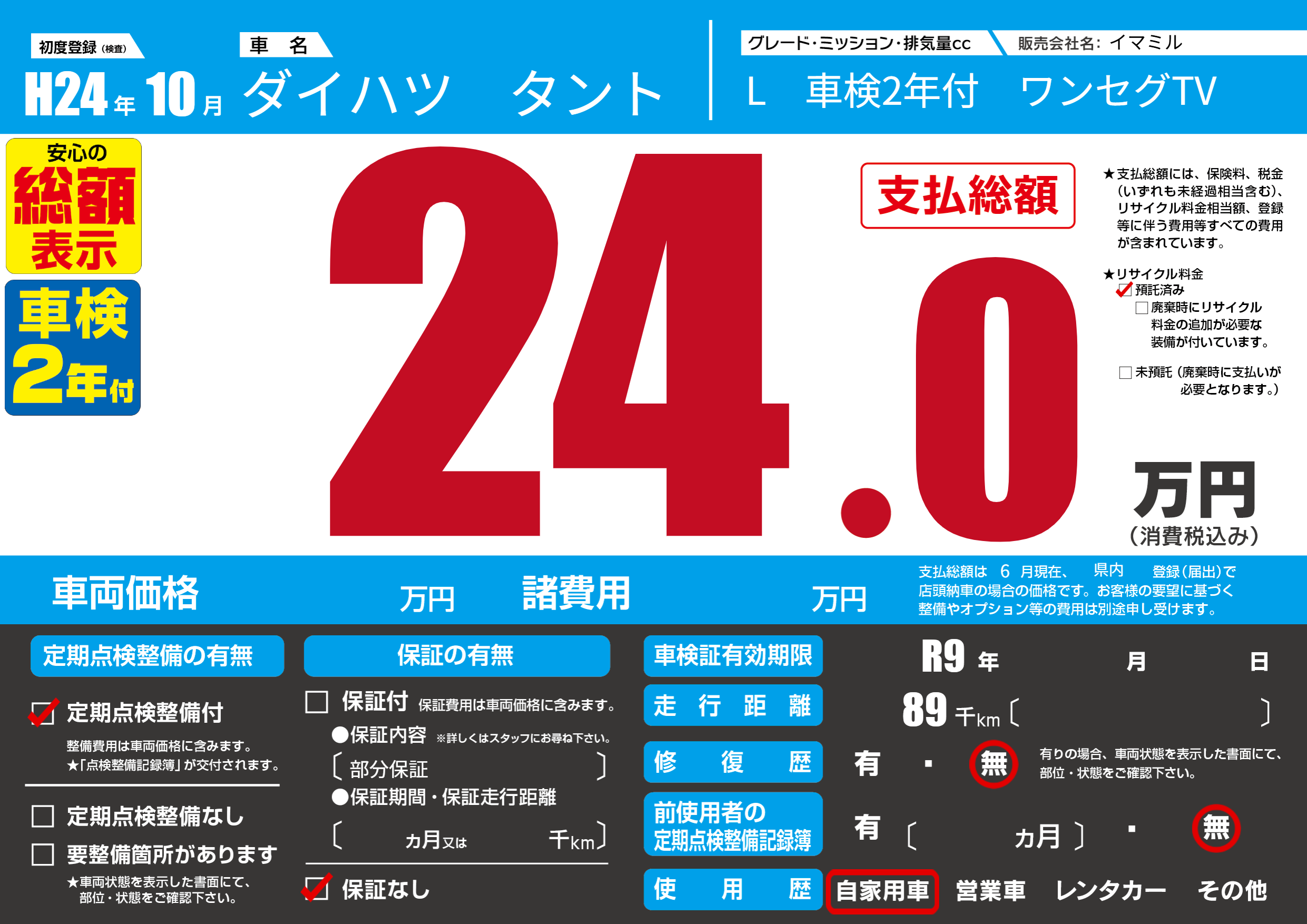 | 走行キロ | 8.9万km | 初年度登録 | H24年10月 |