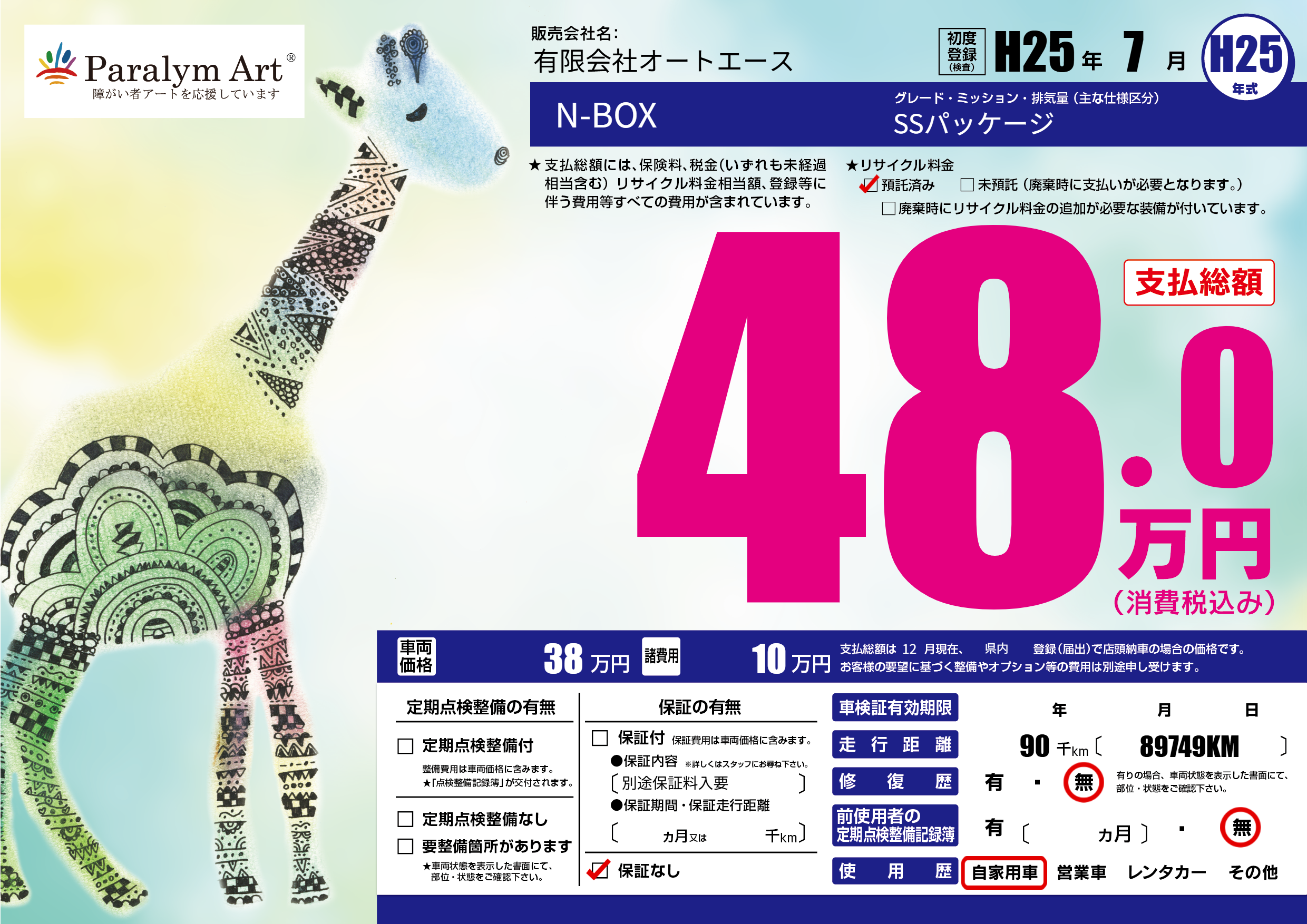 | 走行キロ | 9万km | 初年度登録 | H25年7月 |