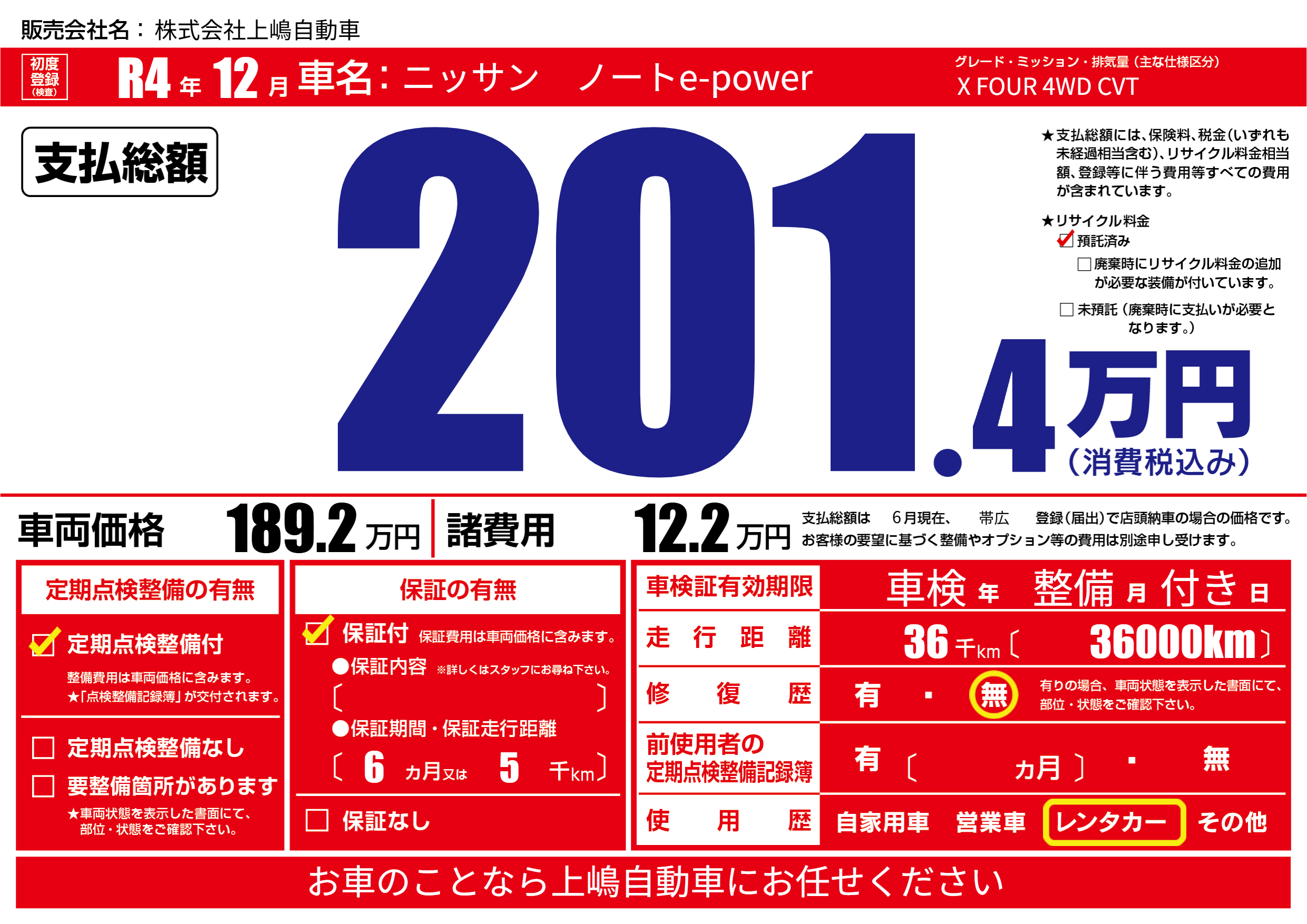 | 車名 | ニッサン ノートe-power | グレード ミッション 排気量 |