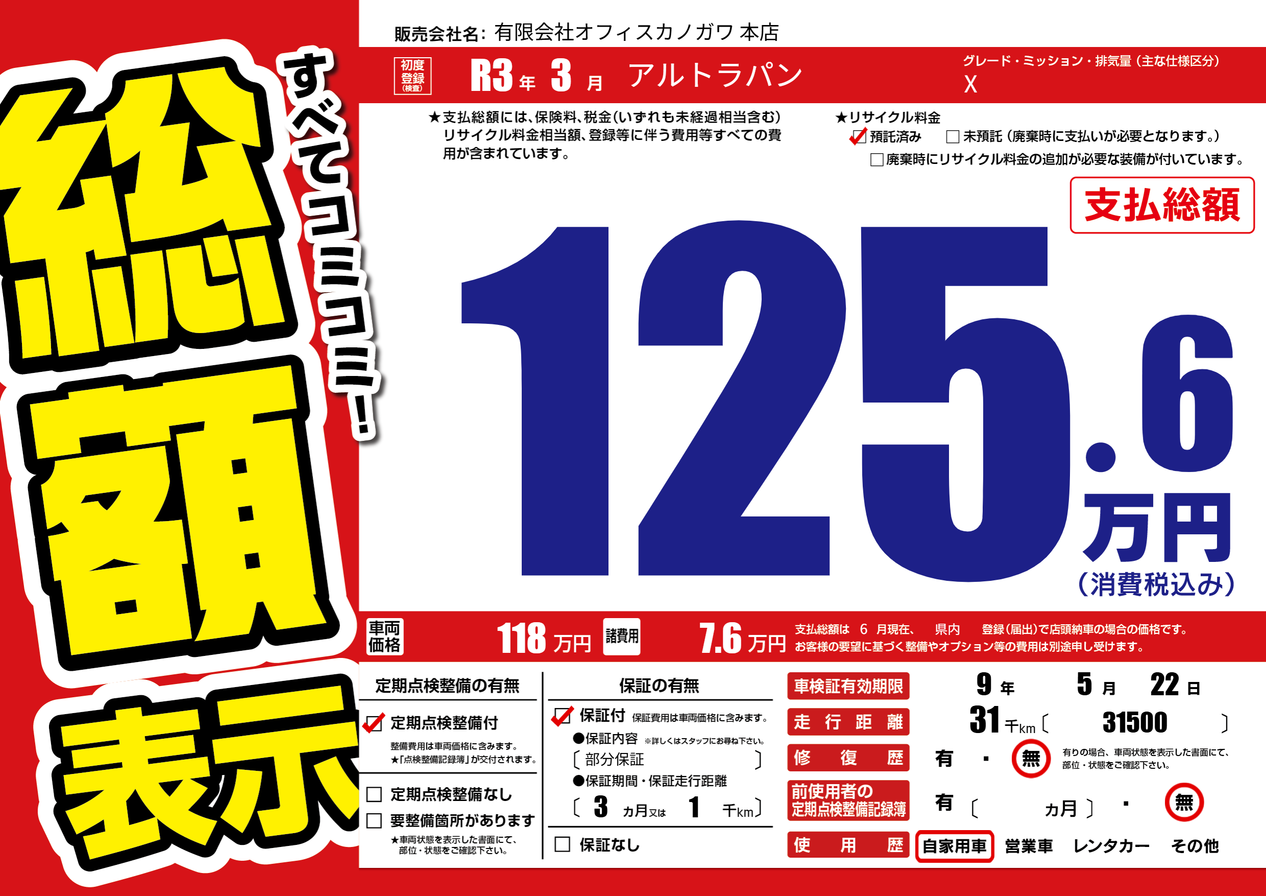 保証付き 保証内容(部分保証) 3ヶ月または(1)千kmまで |