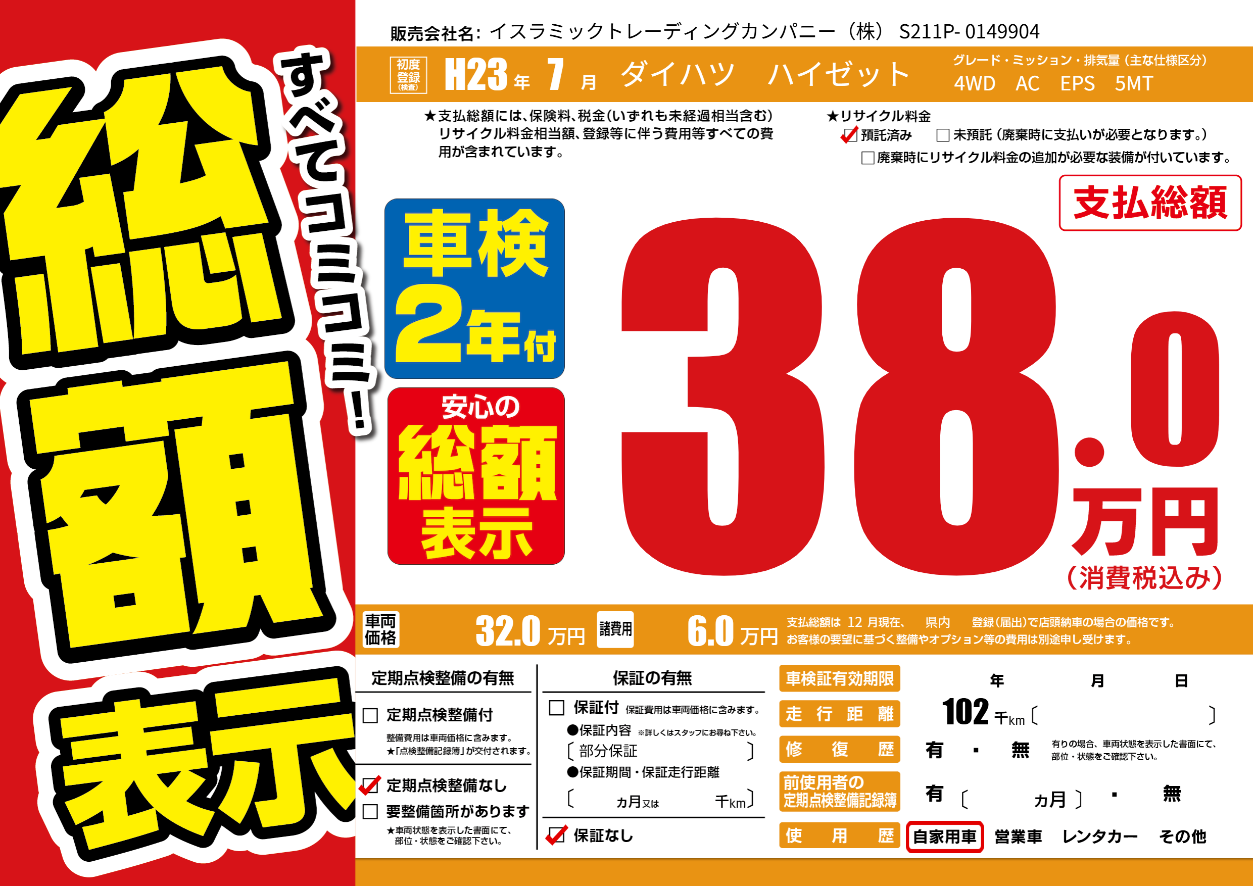 保証なし 保証内容(部分保証) ---ヶ月または()千kmまで |