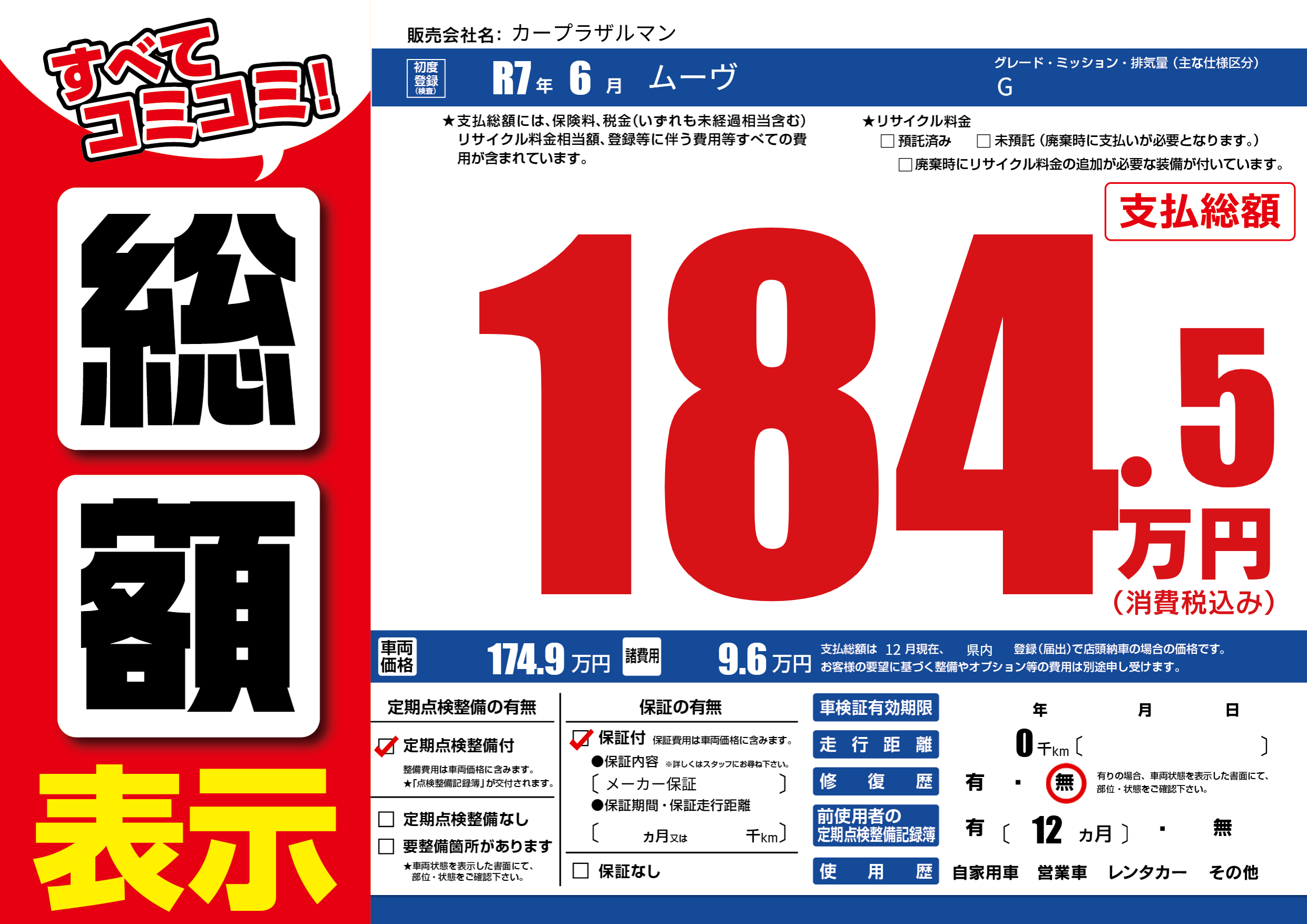| 走行キロ | - | 初年度登録 | R7年6月 |