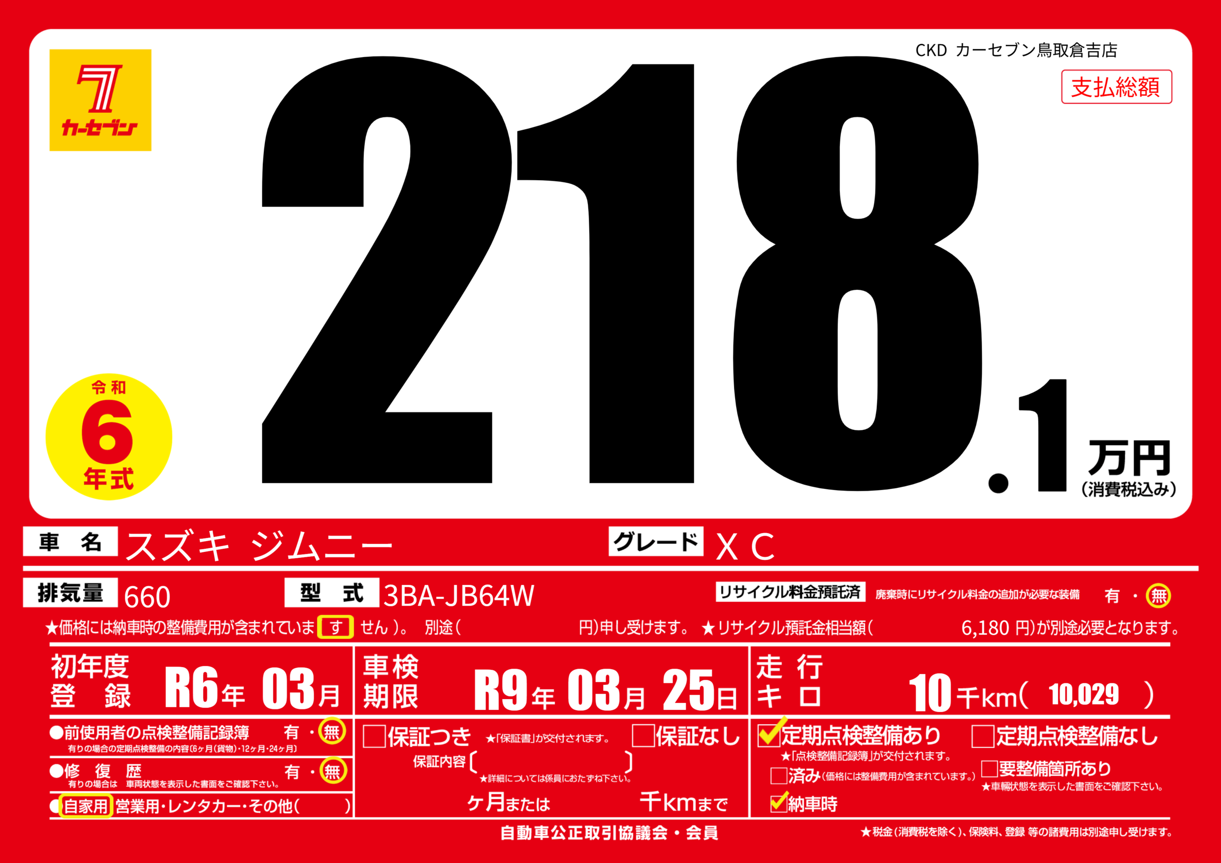 | 走行キロ | 1万km | 初年度登録 | R6年03月 |