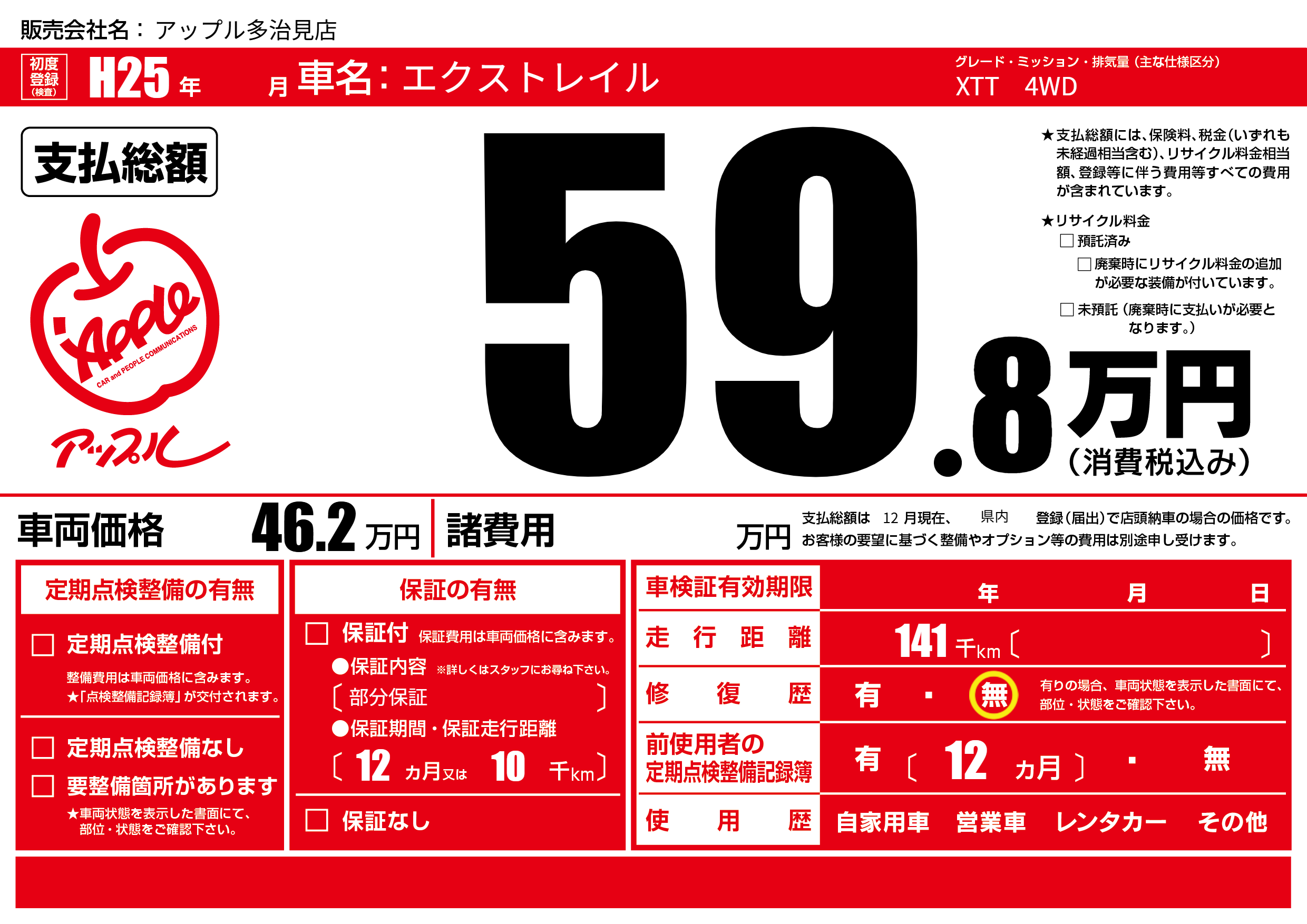 | 走行キロ | 14.1万km | 初年度登録 | H25年---月 |