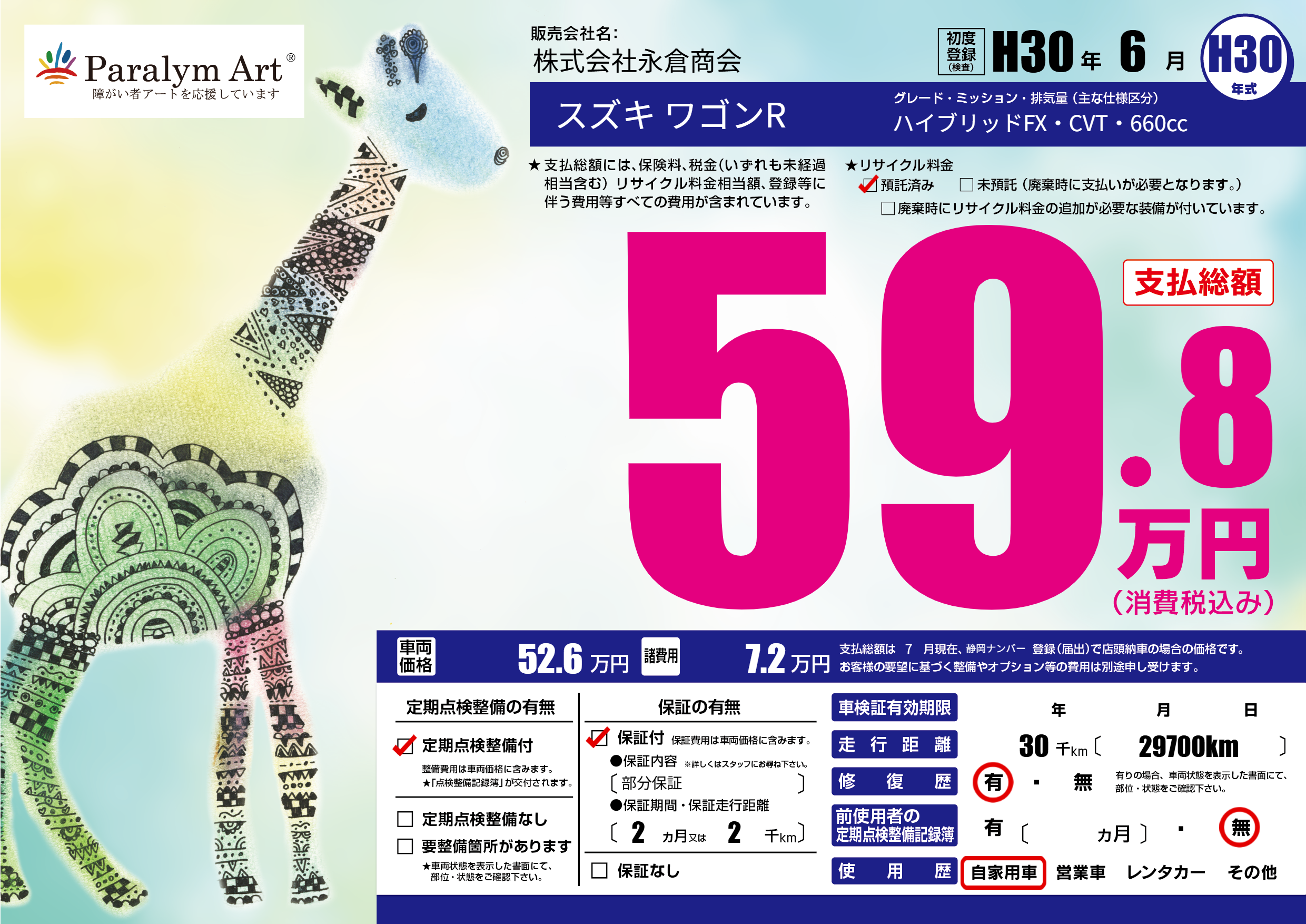 | 走行キロ | 3万km | 初年度登録 | H30年6月 |