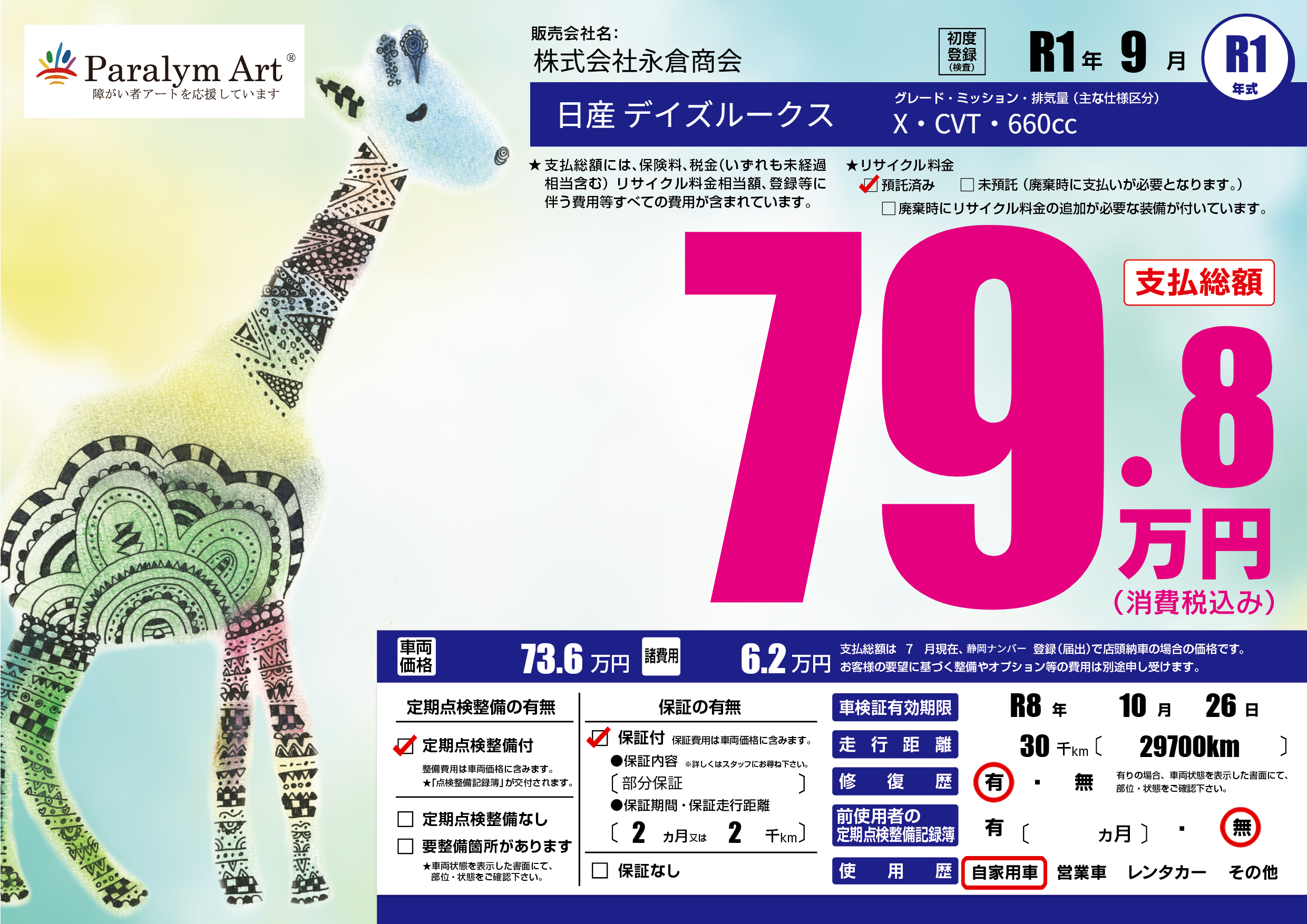| 走行キロ | 3万km | 初年度登録 | R1年9月 |