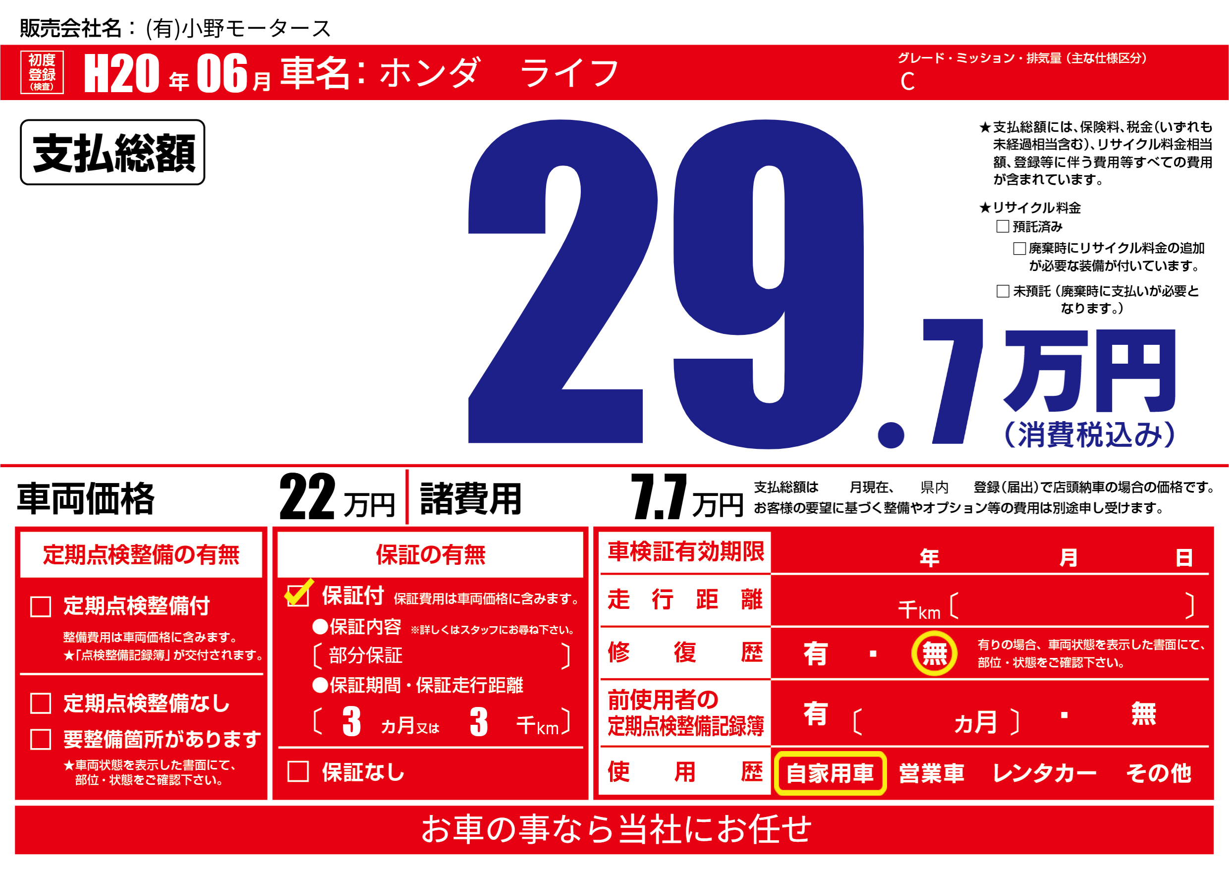| 車名 | ホンダ ライフ | グレード ミッション 排気量 |