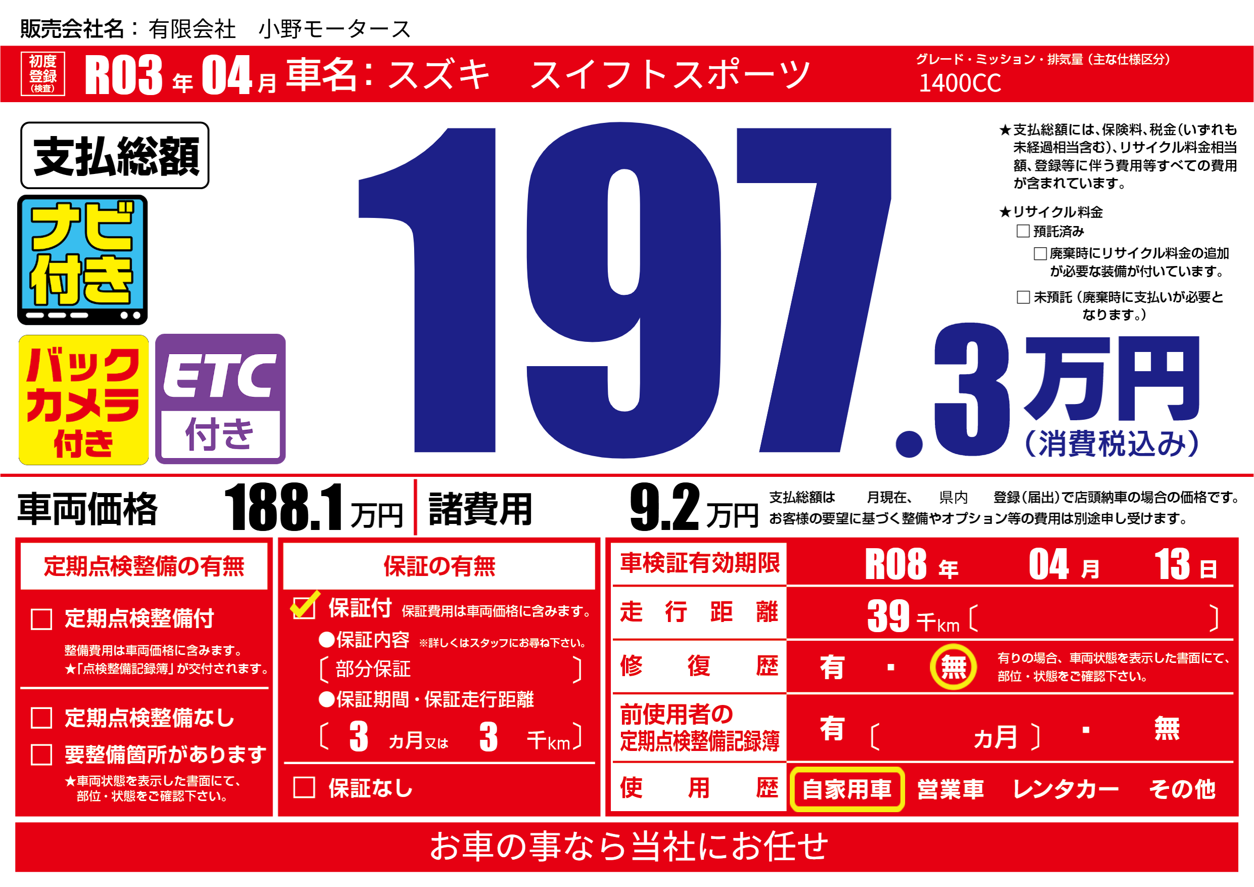 | 走行キロ | 3.9万km | 初年度登録 | R03年04月 |