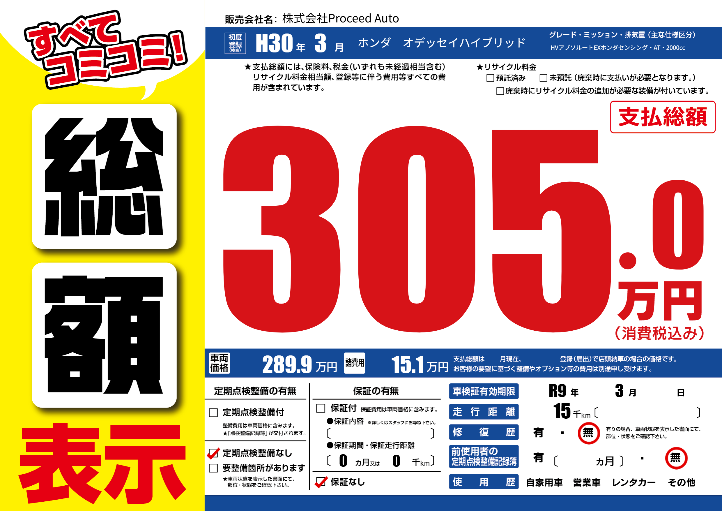 | 車名 | ホンダ オデッセイハイブリッド | グレード ミッション 排気量 |