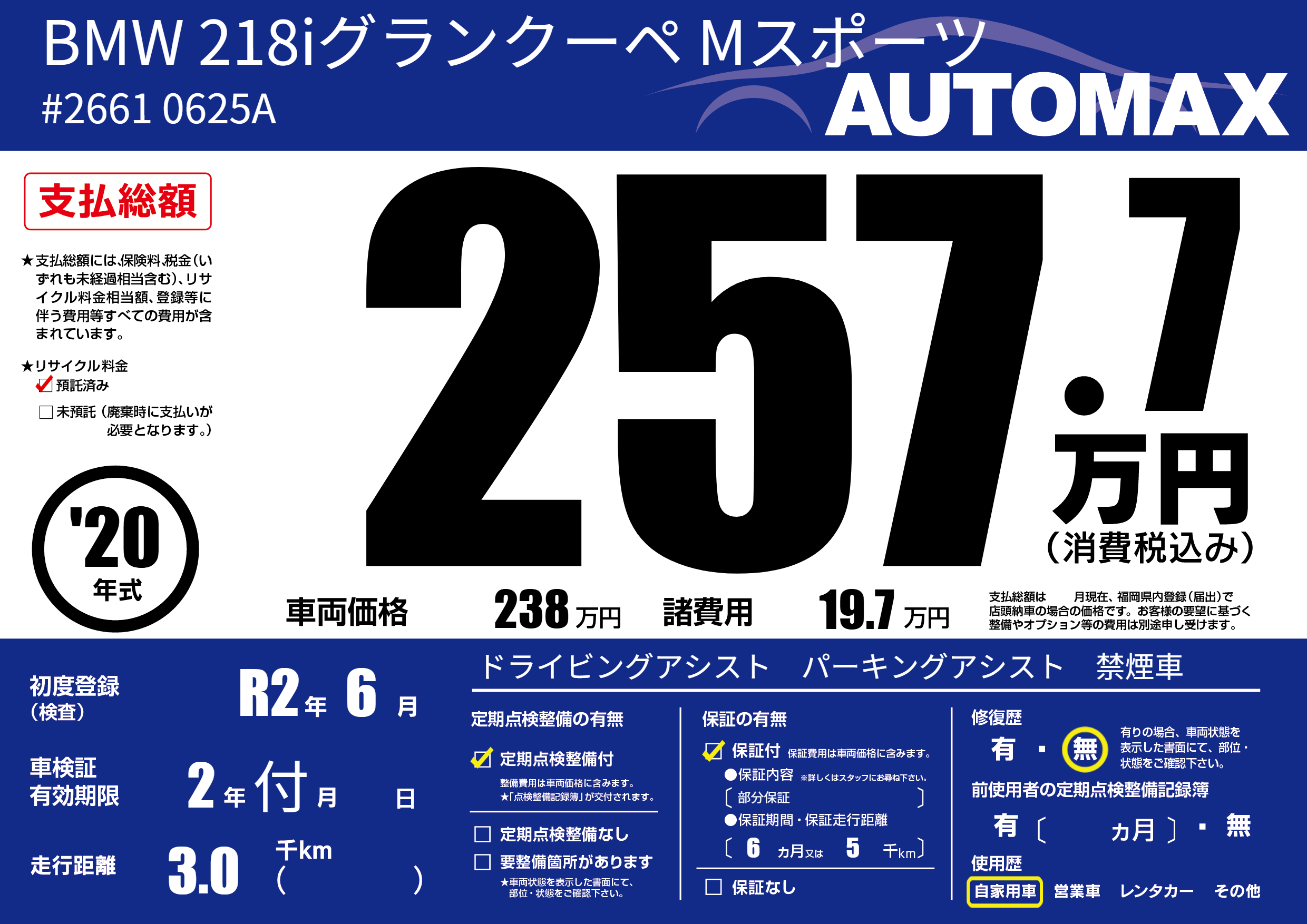 | 車名 | BMW 218iグランクーペ Mスポーツ | グレード ミッション 排気量 |