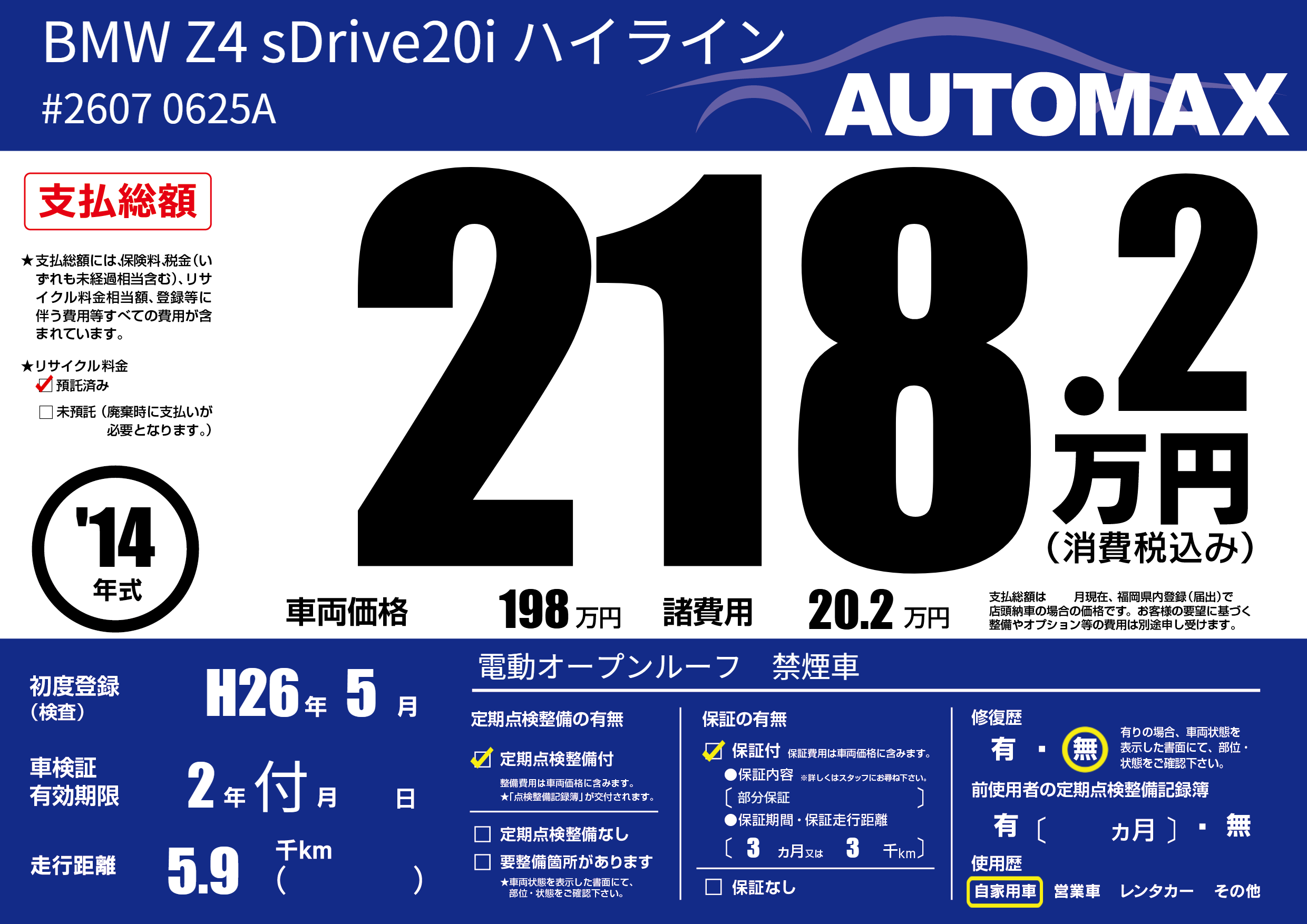 | 走行キロ | 0.5万km | 初年度登録 | H26年5月 |