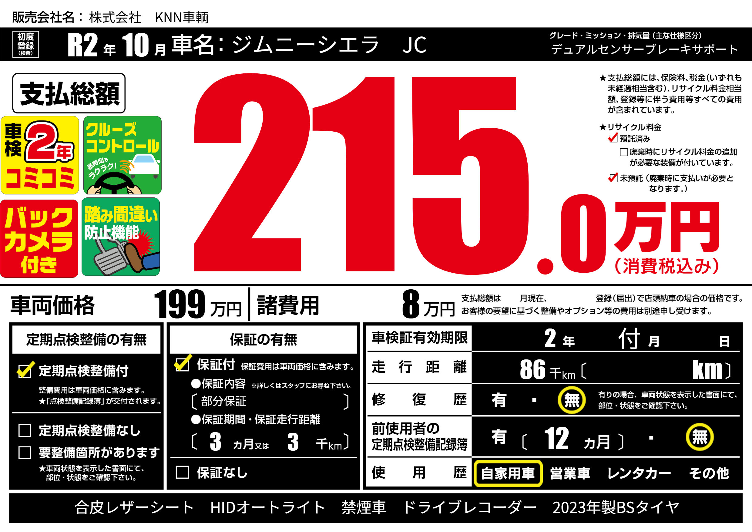 | 車名 | ジムニーシエラ JC | グレード ミッション 排気量 |