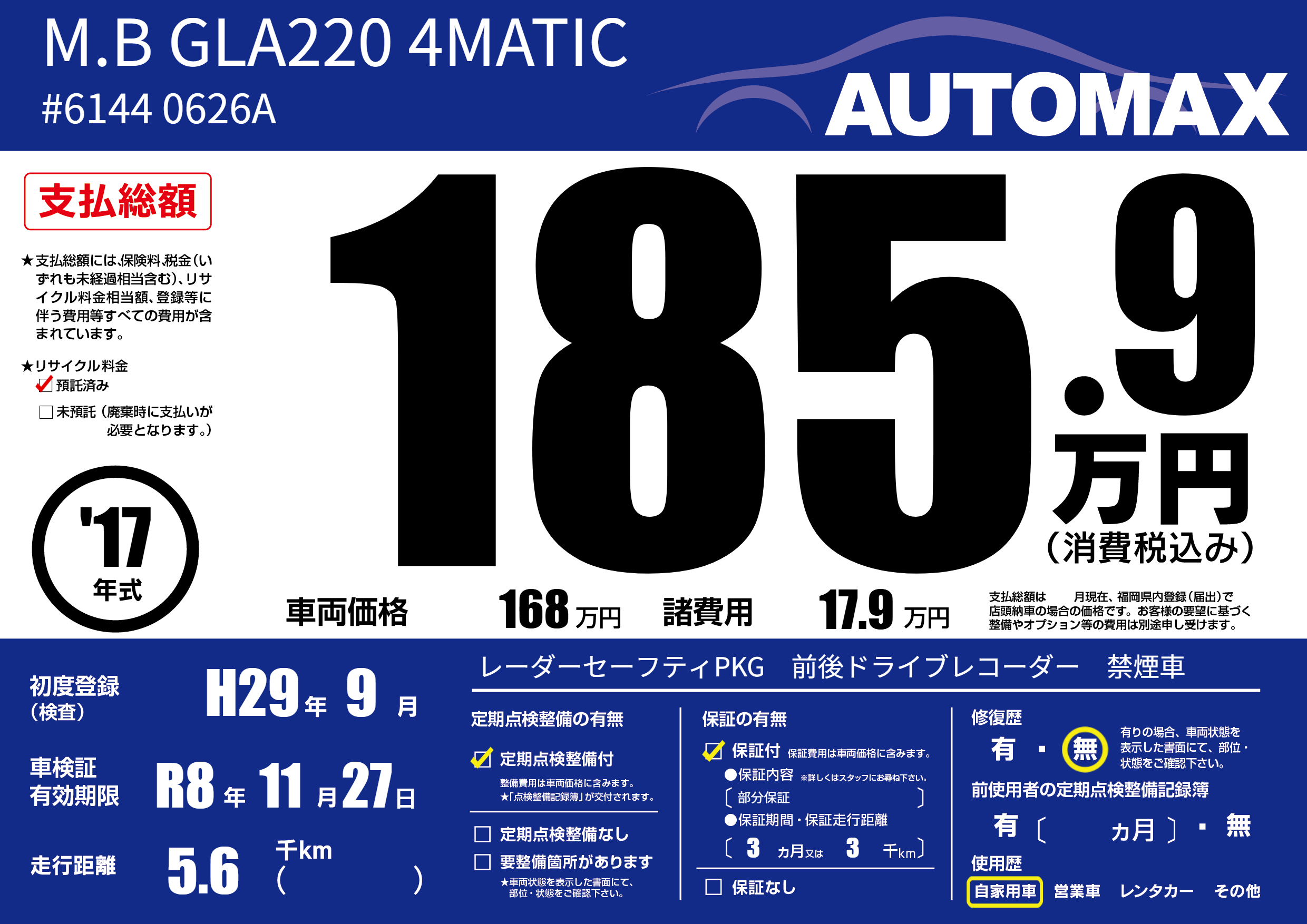| 車名 | M.B GLA220 4MATIC | グレード ミッション 排気量 |