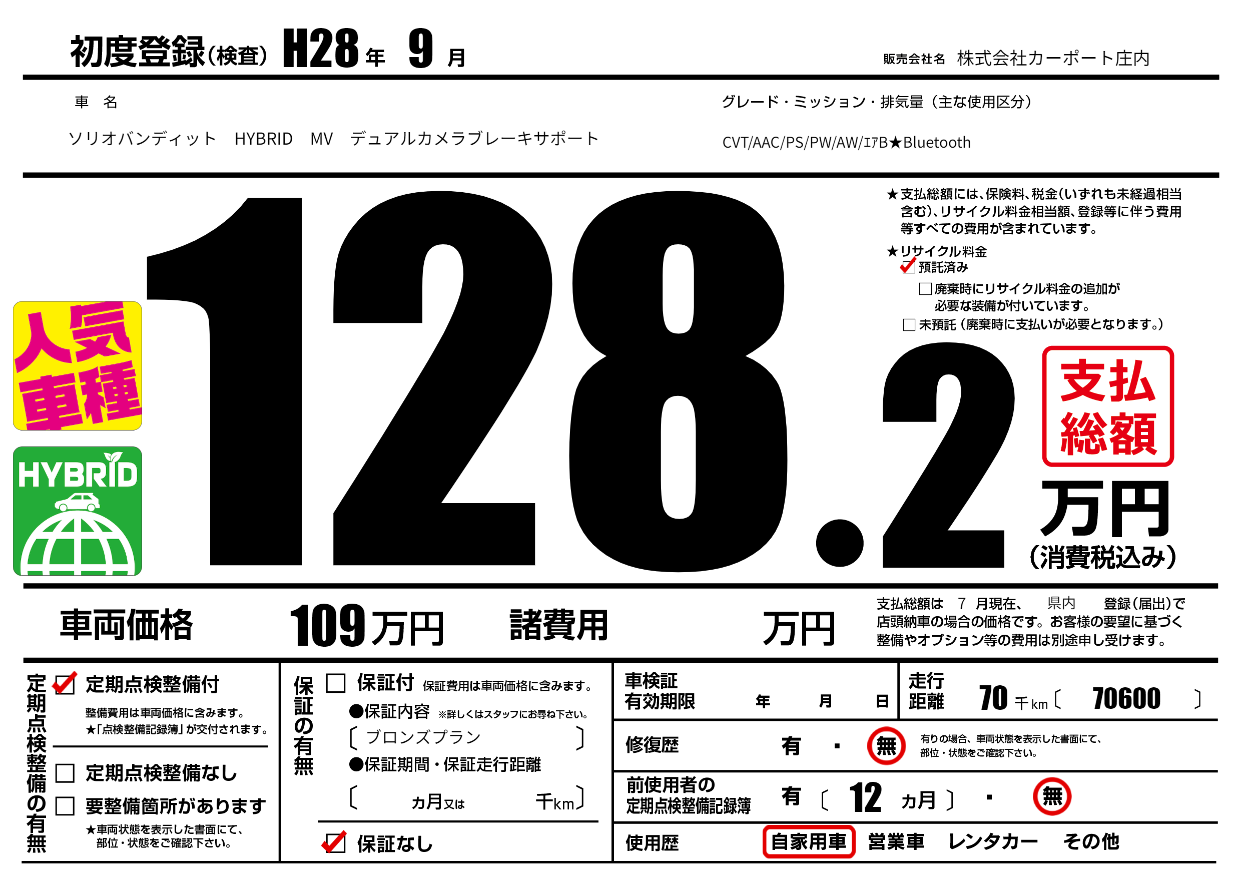 | 車名 | ソリオバンディット HYBRID MV デュアルカメラブレーキサポート | グレード ミッション 排気量 |