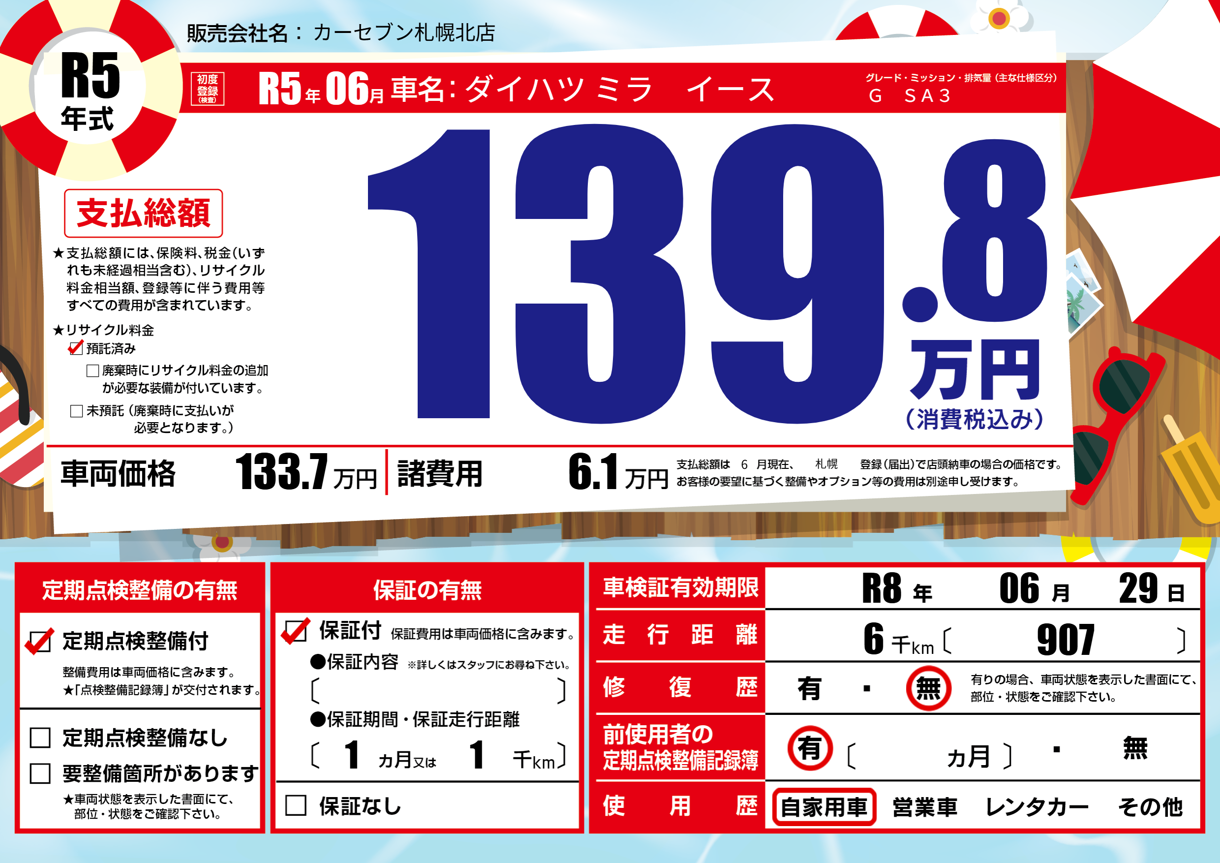 | 走行キロ | 0.6万km | 初年度登録 | R5年06月 |