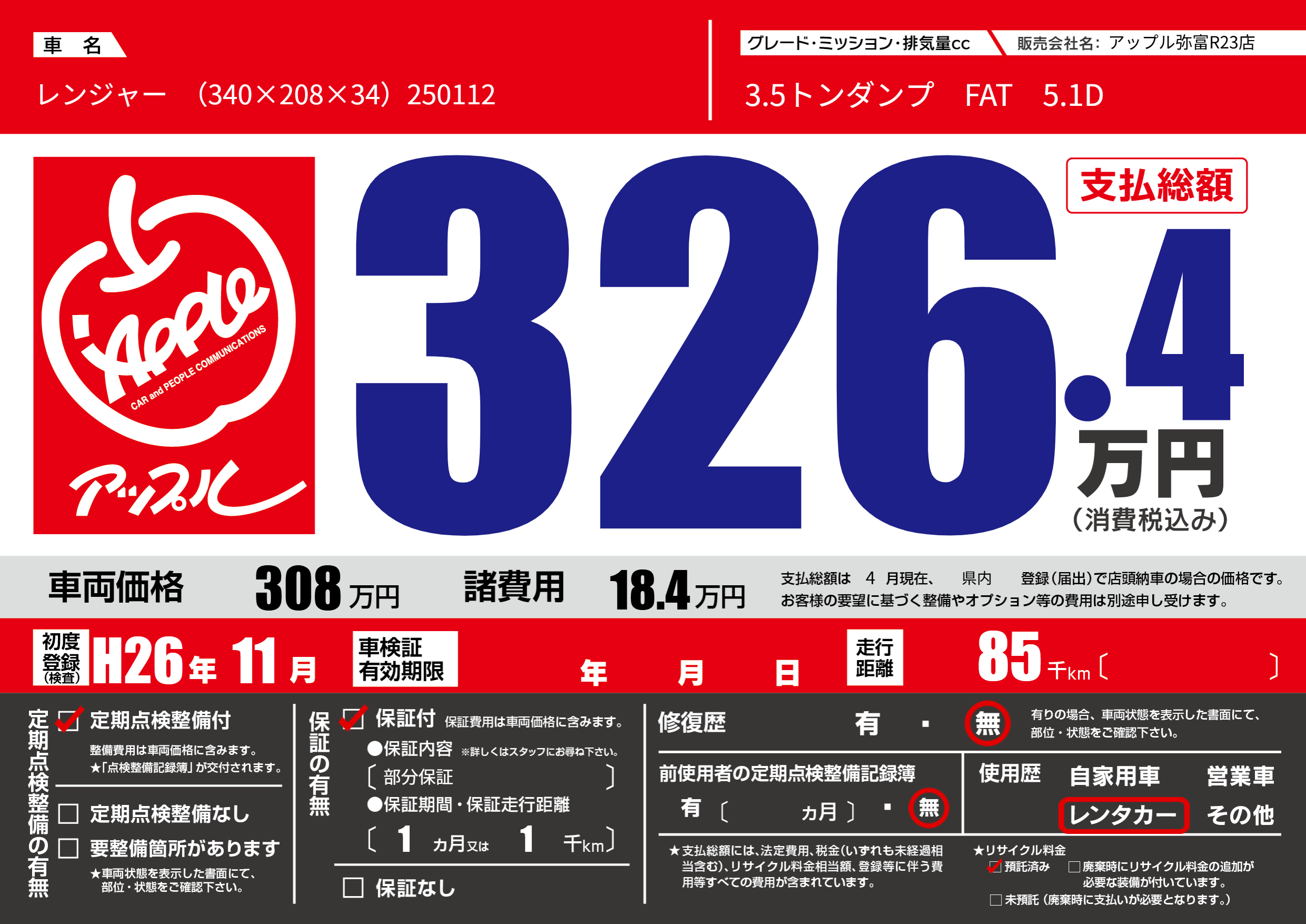 | 車名 | レンジャー (340×208×34)250112 | グレード ミッション 排気量 |