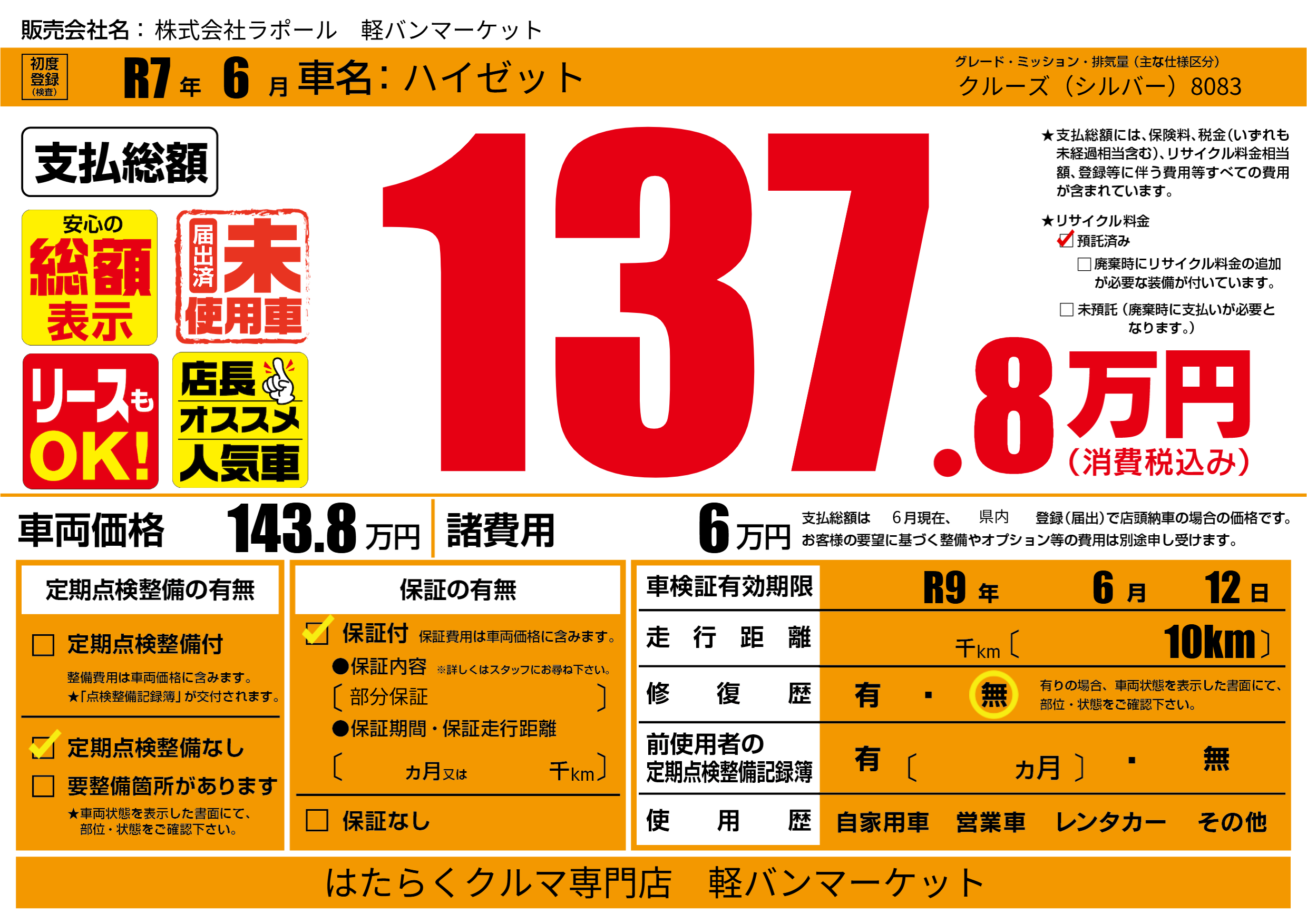 なし | 車検制限 | R9年6月12月 |