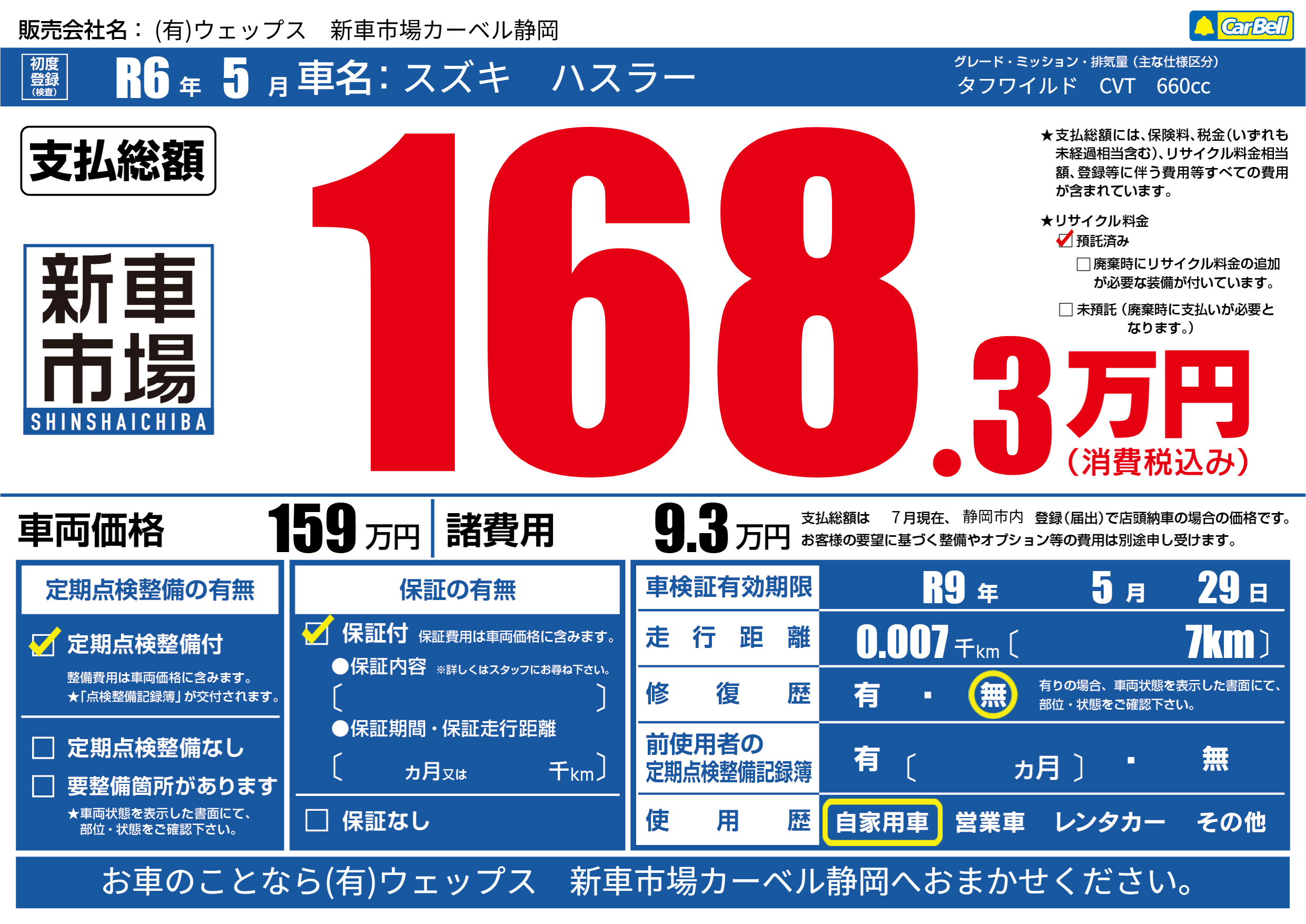 | 車名 | スズキ ハスラー | グレード ミッション 排気量 |