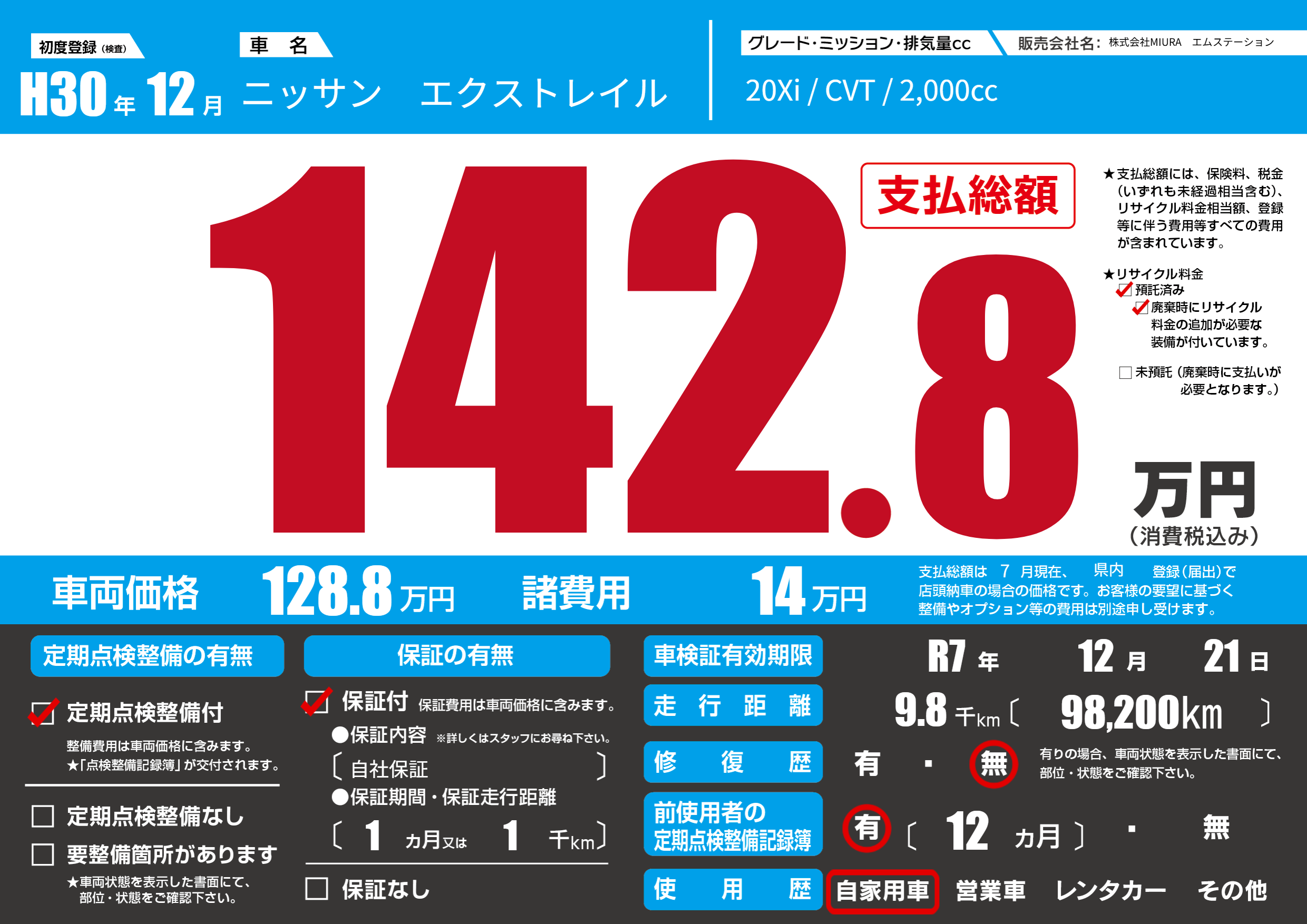 | 走行キロ | 0.9万km | 初年度登録 | H30年12月 |