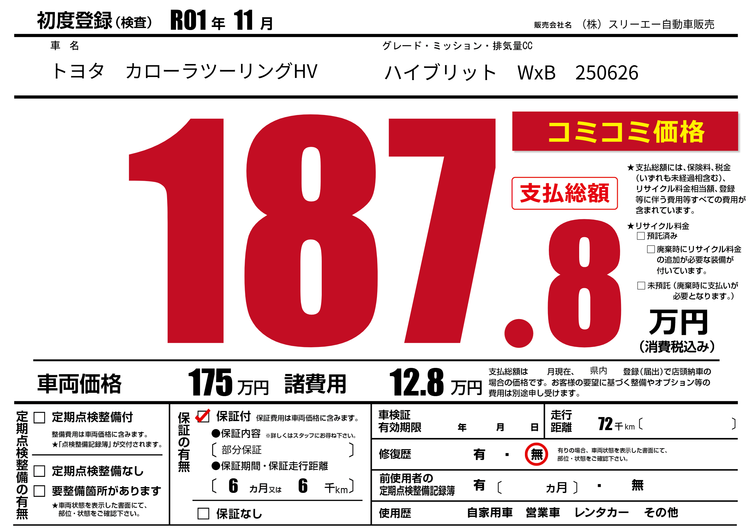 保証付き 保証内容(部分保証) 6ヶ月または(6)千kmまで |