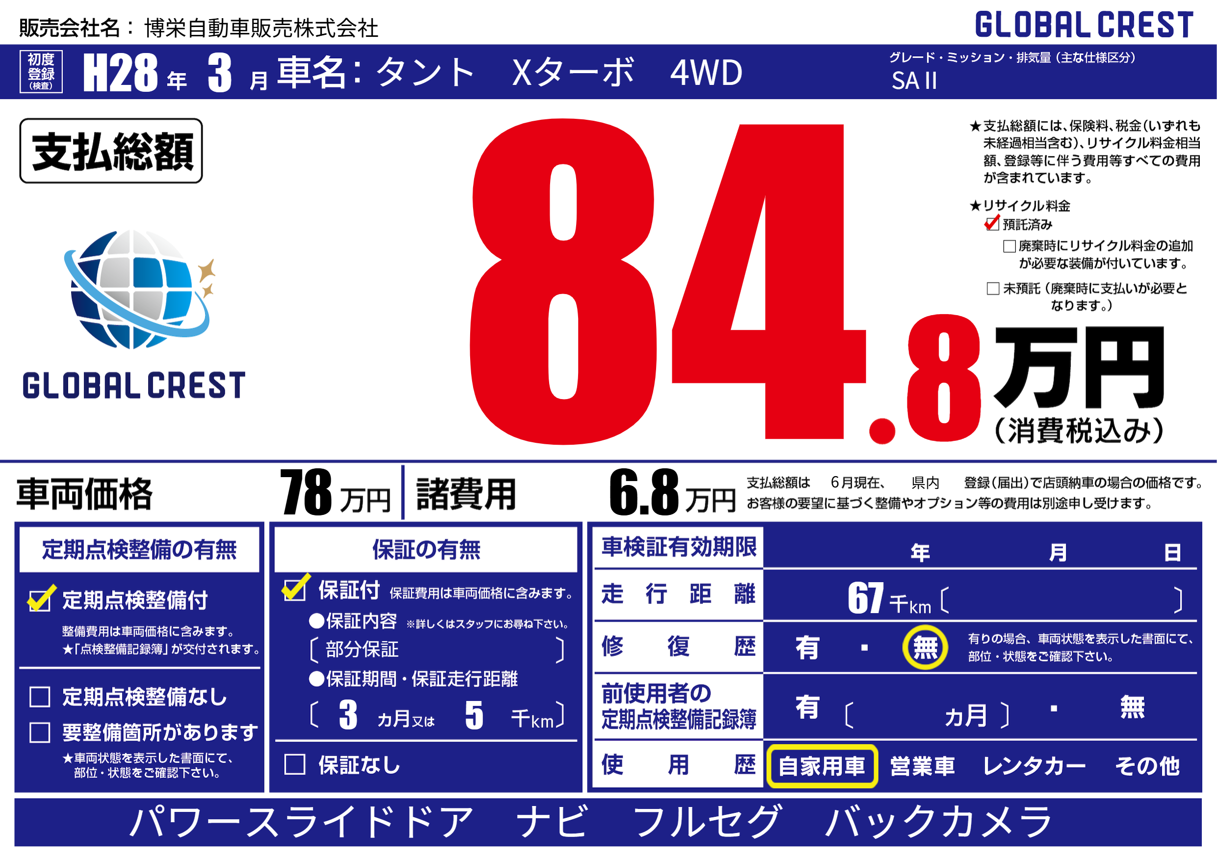 | 走行キロ | 6.7万km | 初年度登録 | H28年3月 |