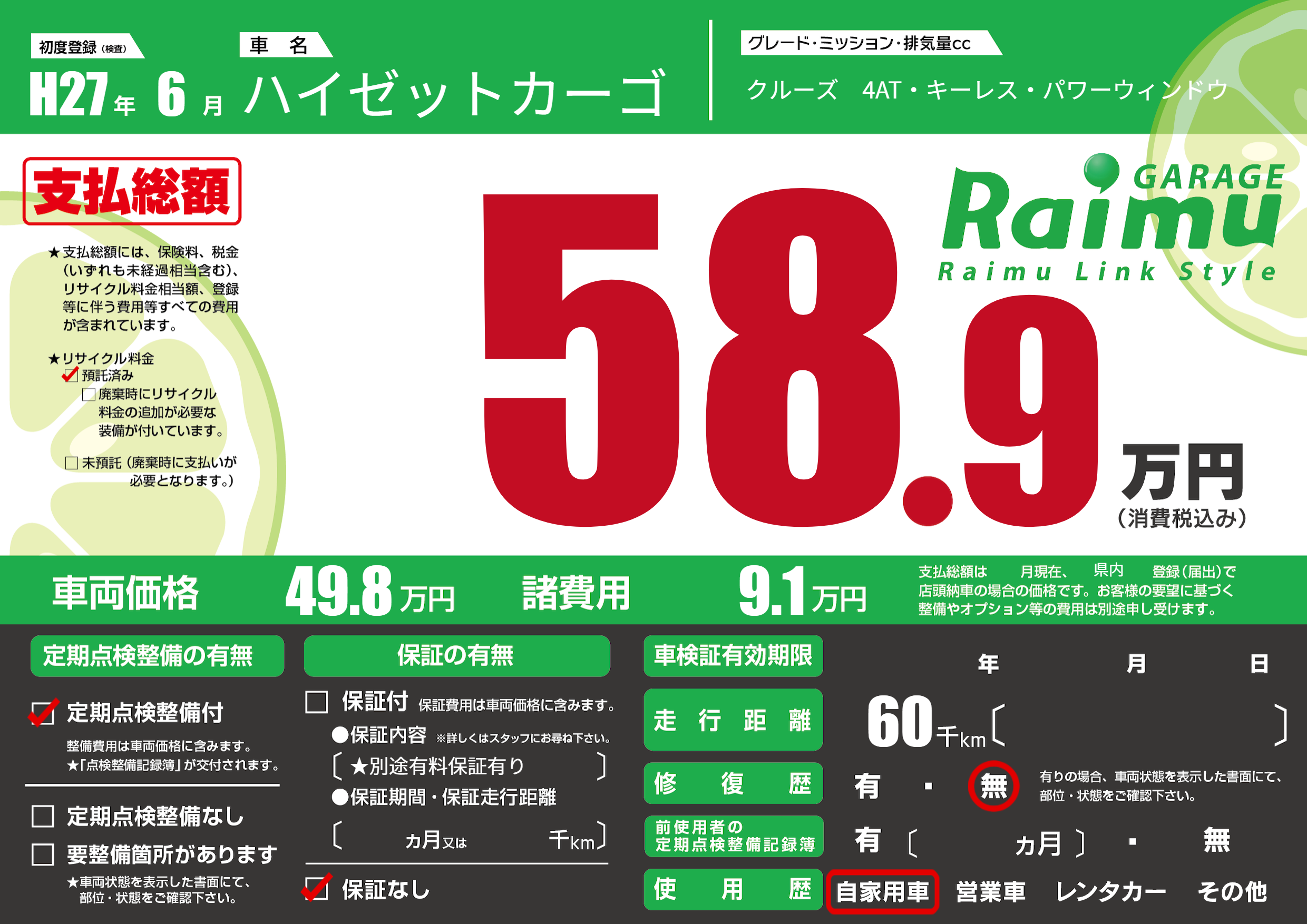 | 車名 | ハイゼットカーゴ | グレード ミッション 排気量 |