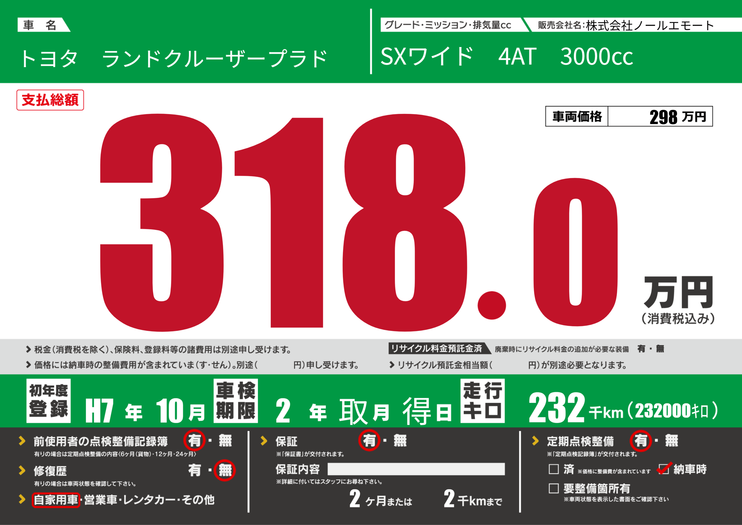 | 走行キロ | 23.2万km | 初年度登録 | H7年10月 |