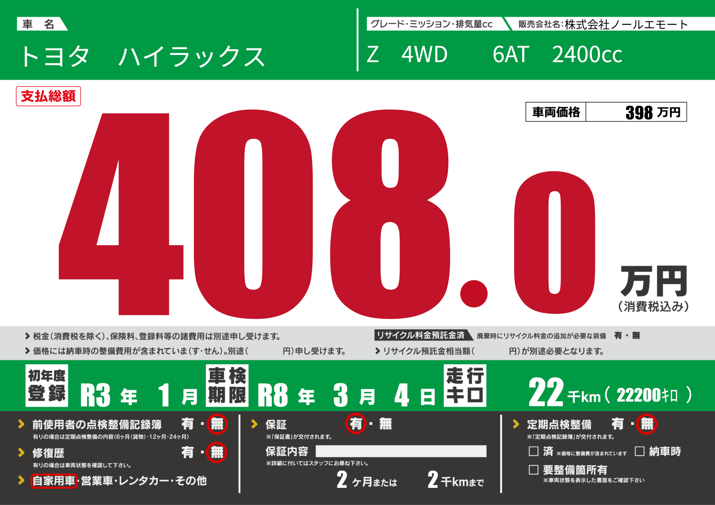 | 車名 | トヨタ ハイラックス | グレード ミッション 排気量 |