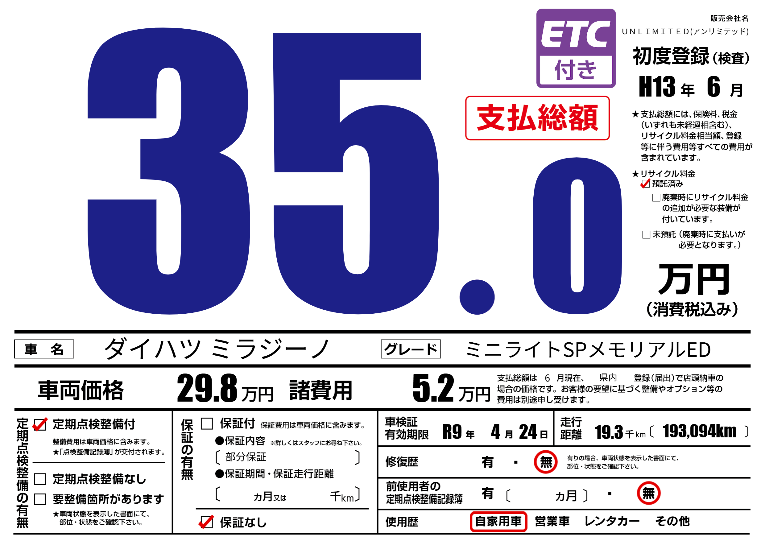 | 走行キロ | 1.9万km | 初年度登録 | H13年6月 |
