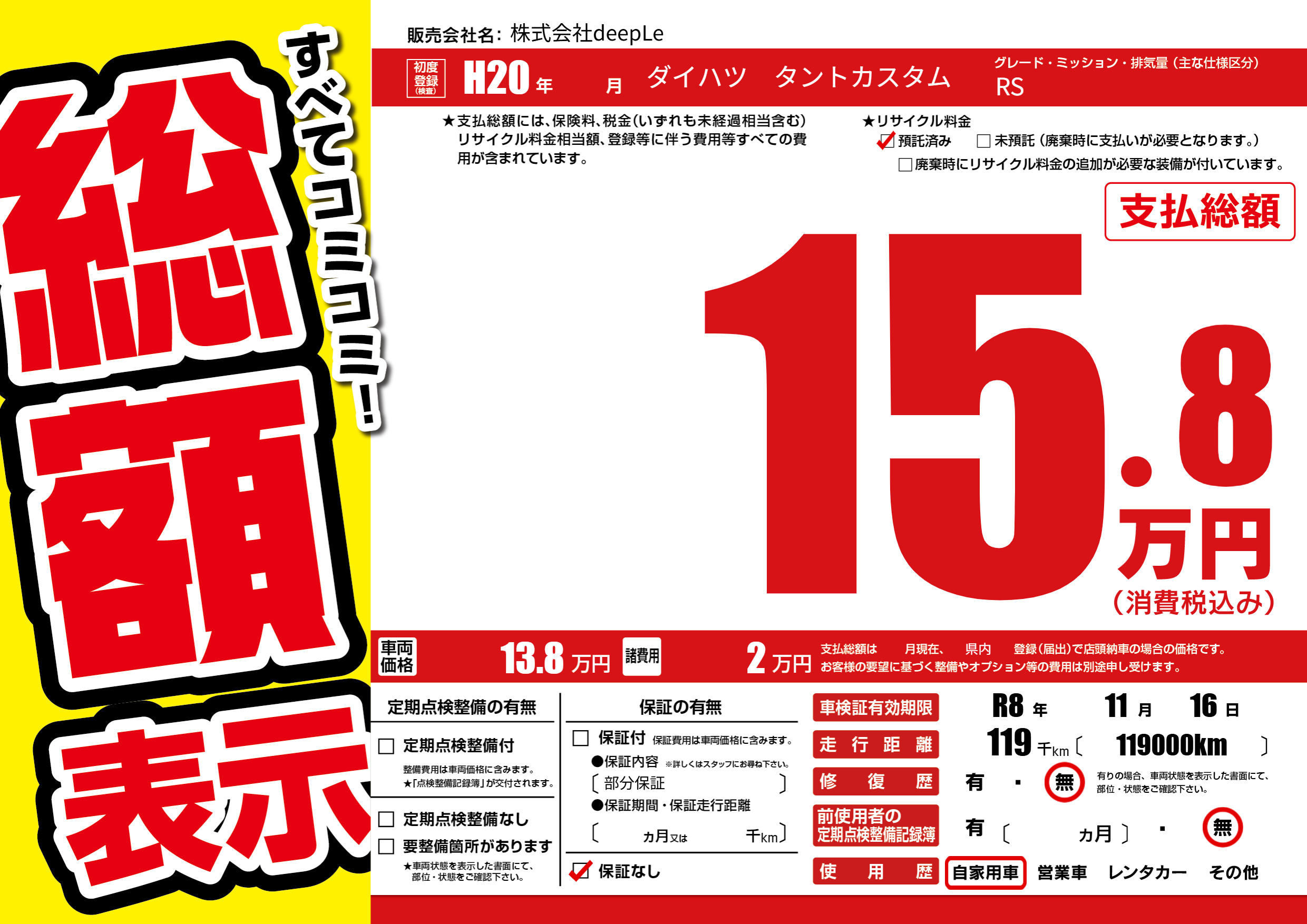 | 車名 | ダイハツ タントカスタム | グレード ミッション 排気量 |