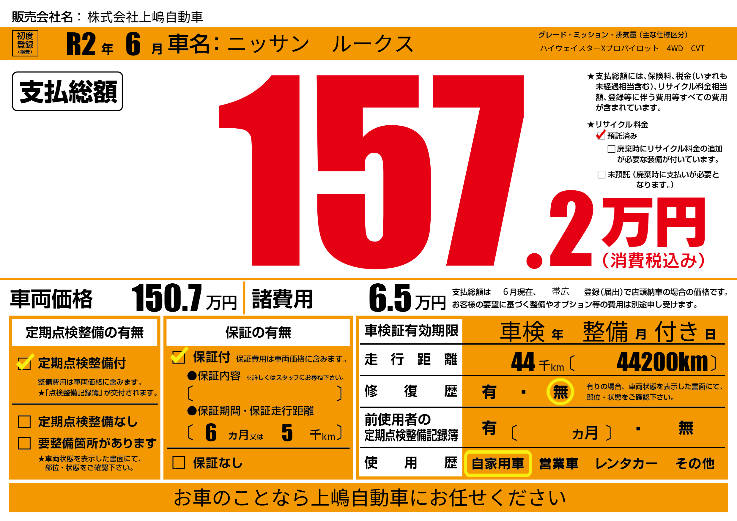 | 車名 | ニッサン ルークス | グレード ミッション 排気量 |