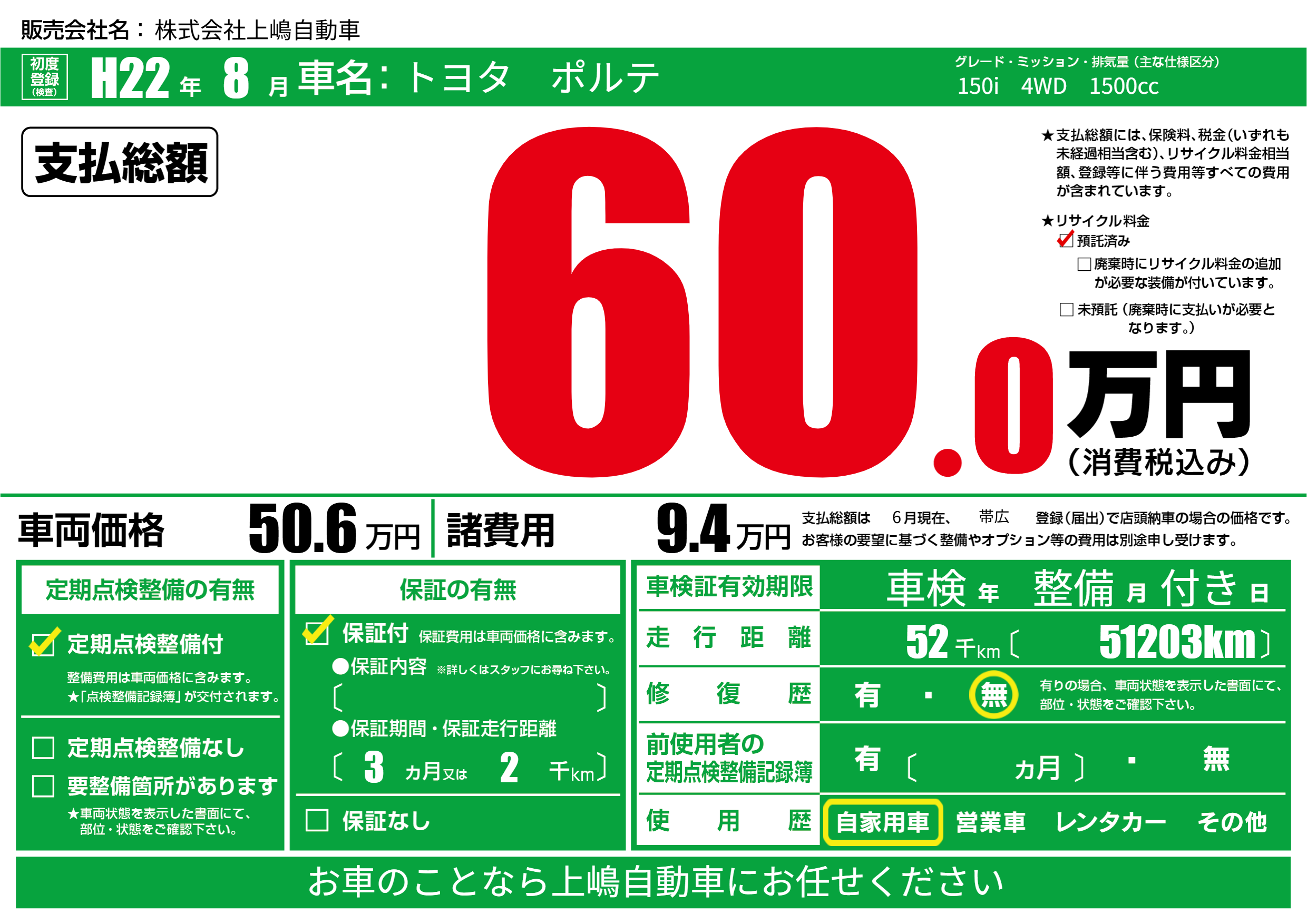 | 車名 | トヨタ ポルテ | グレード ミッション 排気量 |