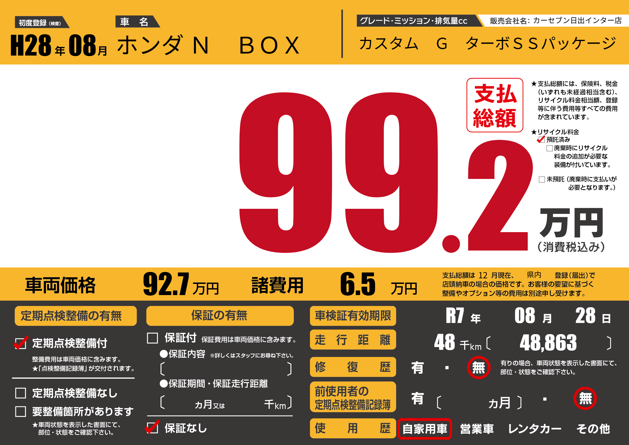 | 走行キロ | 4.8万km | 初年度登録 | H28年08月 |