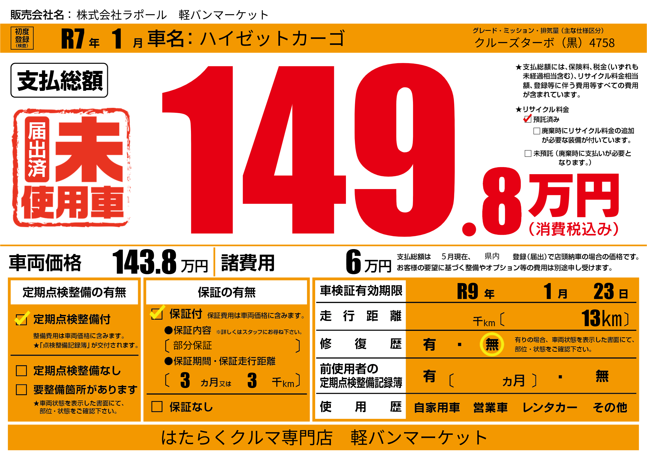 | 車名 | ハイゼットカーゴ | グレード ミッション 排気量 |