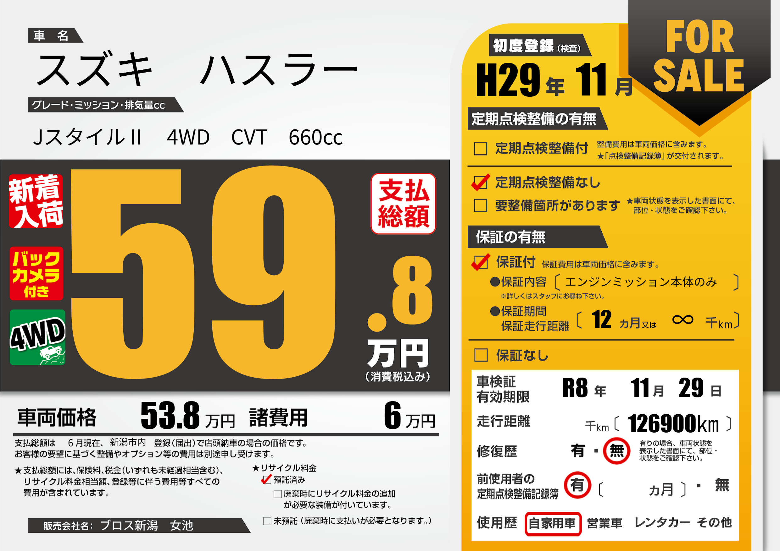 | 車名 | スズキ ハスラー | グレード ミッション 排気量 |