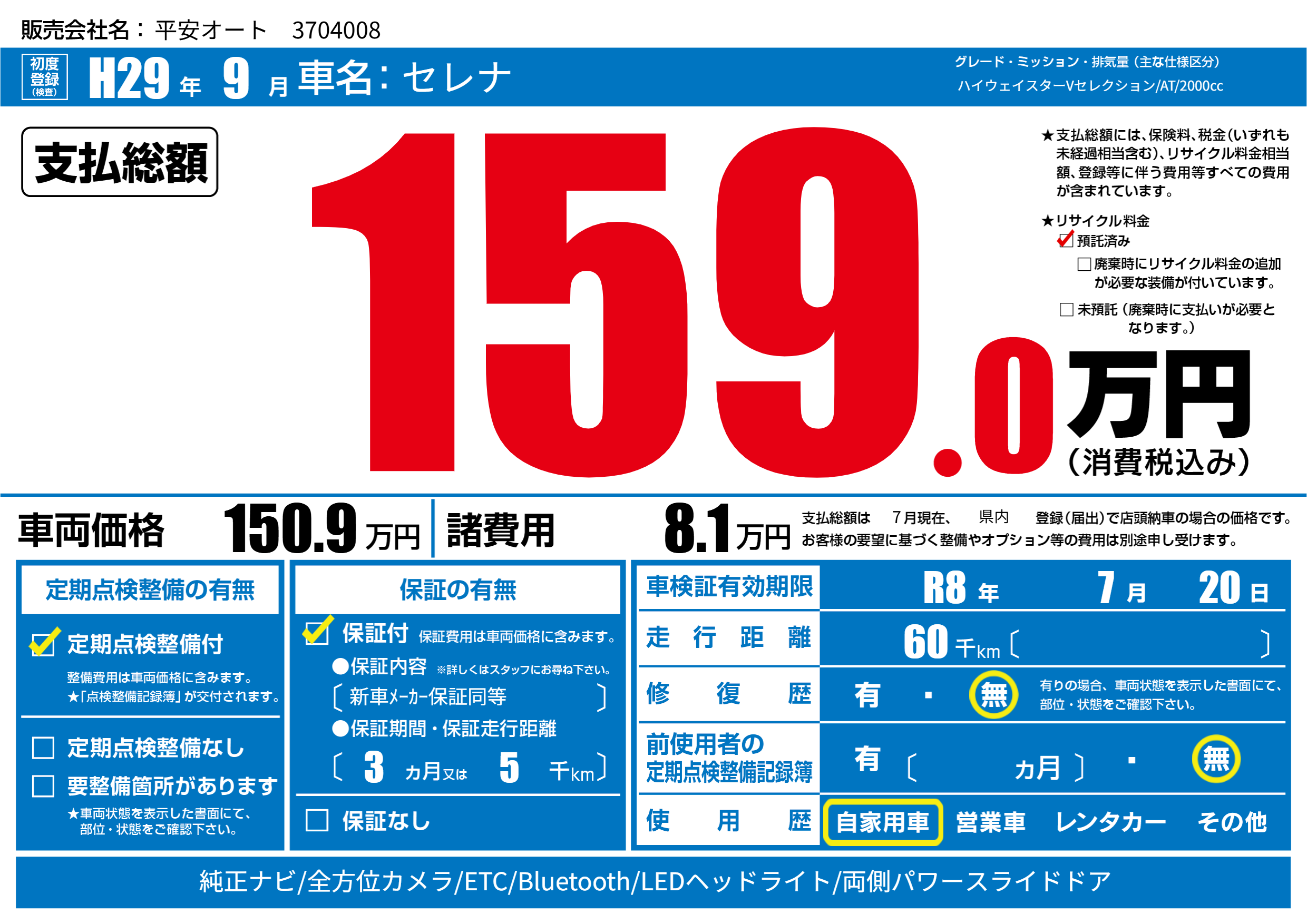 | 車名 | セレナ | グレード ミッション 排気量 |