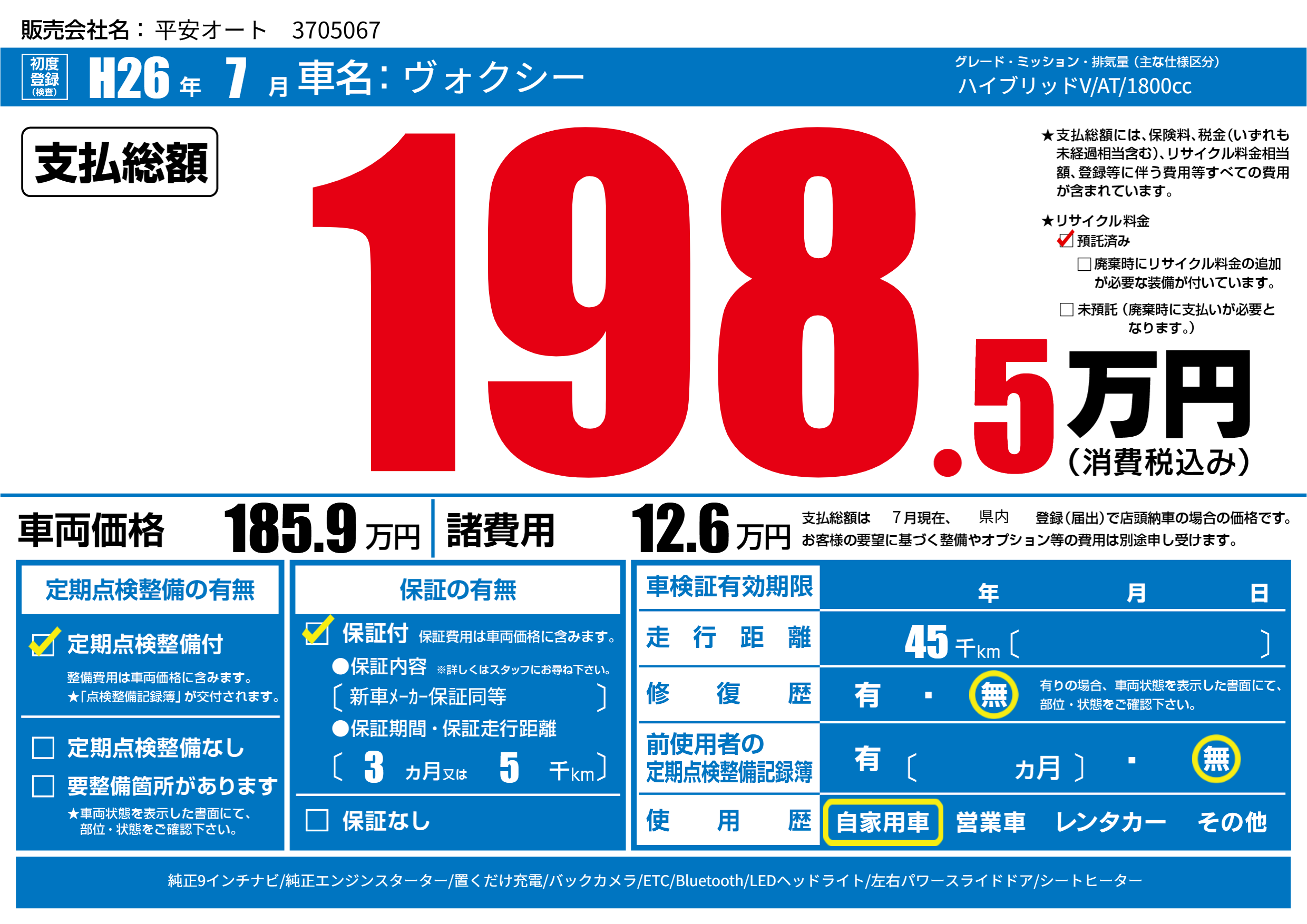 | 走行キロ | 4.5万km | 初年度登録 | H26年7月 |
