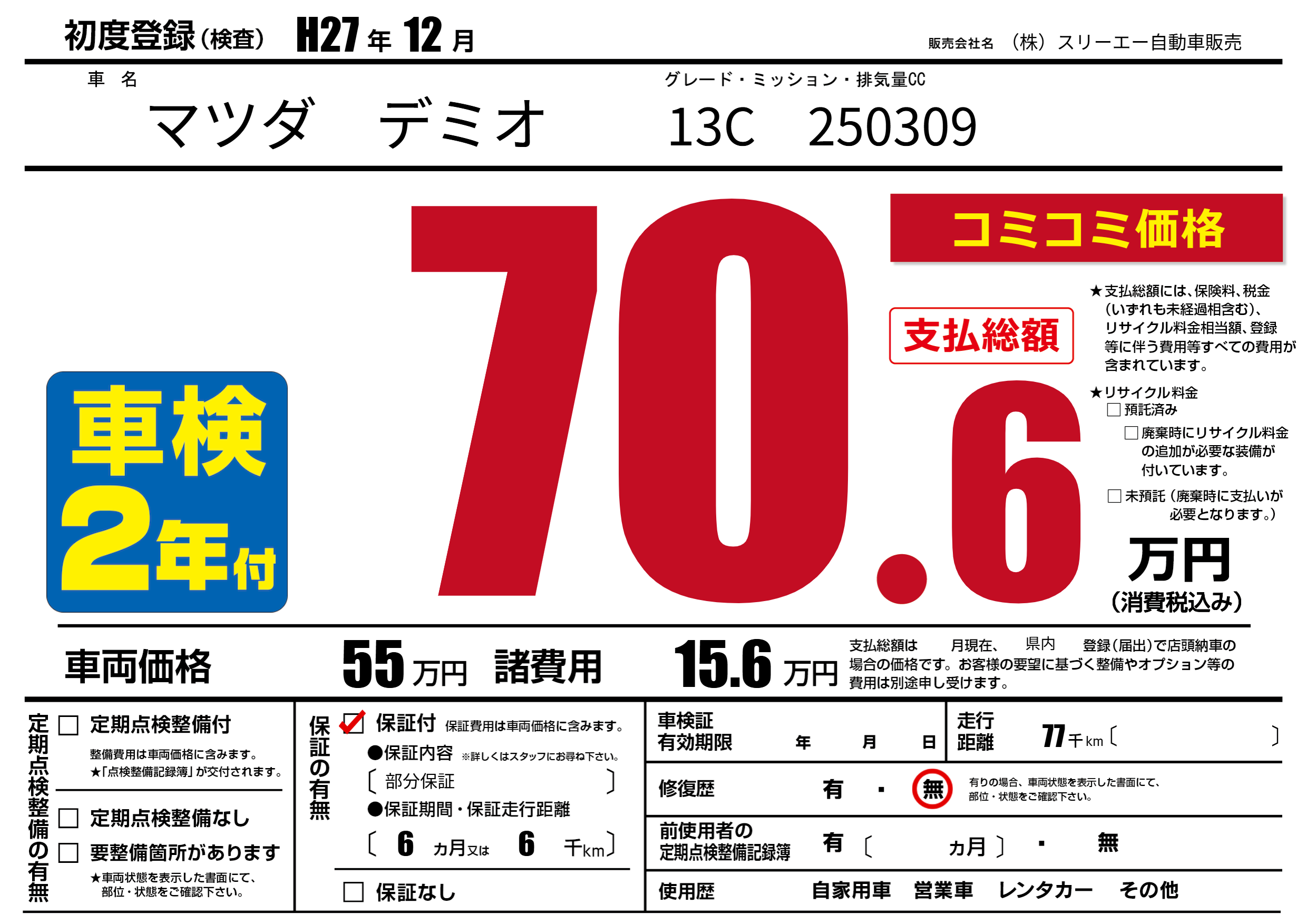 | 車名 | マツダ デミオ | グレード ミッション 排気量 |