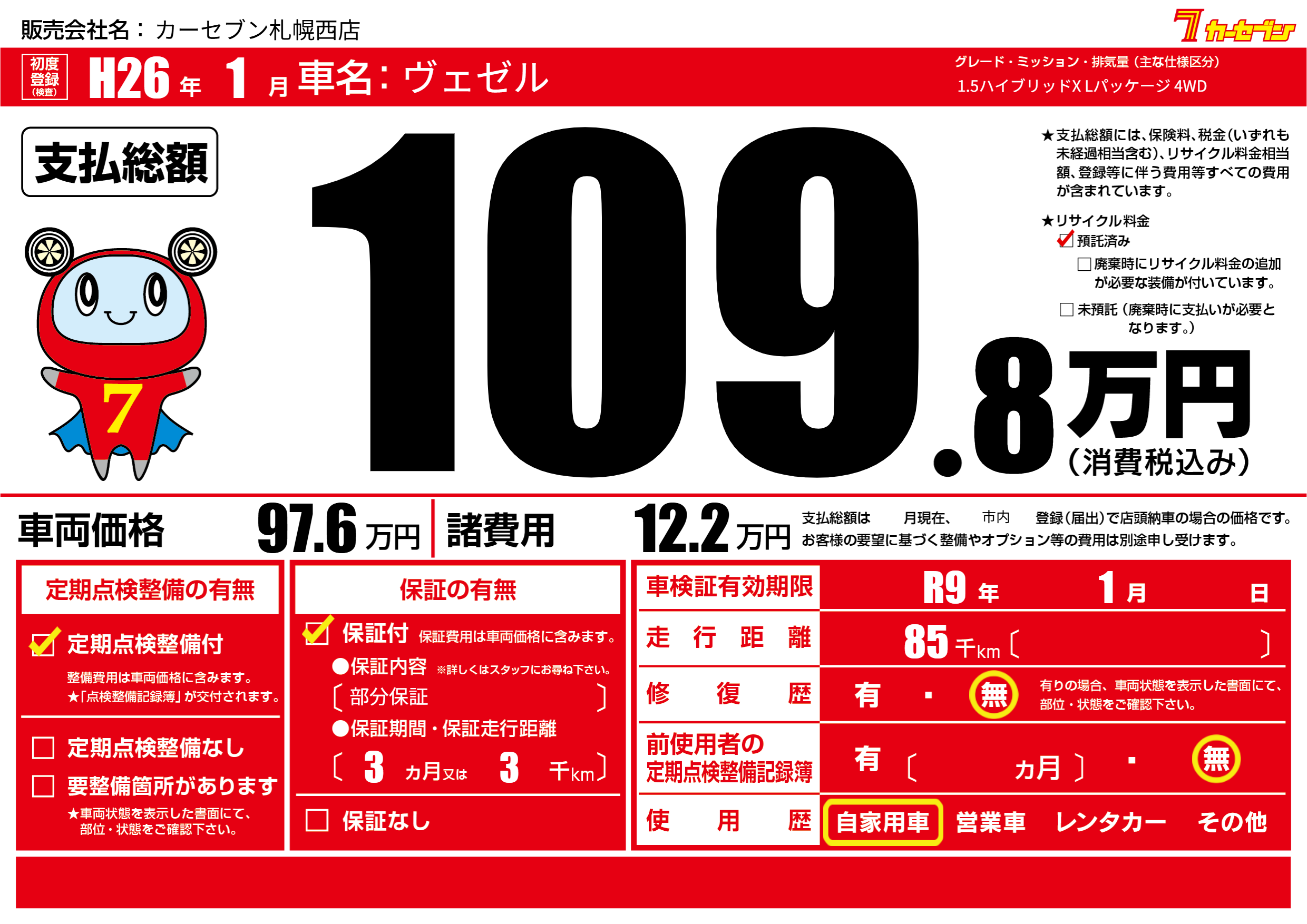 | 車名 | ヴェゼル | グレード ミッション 排気量 |