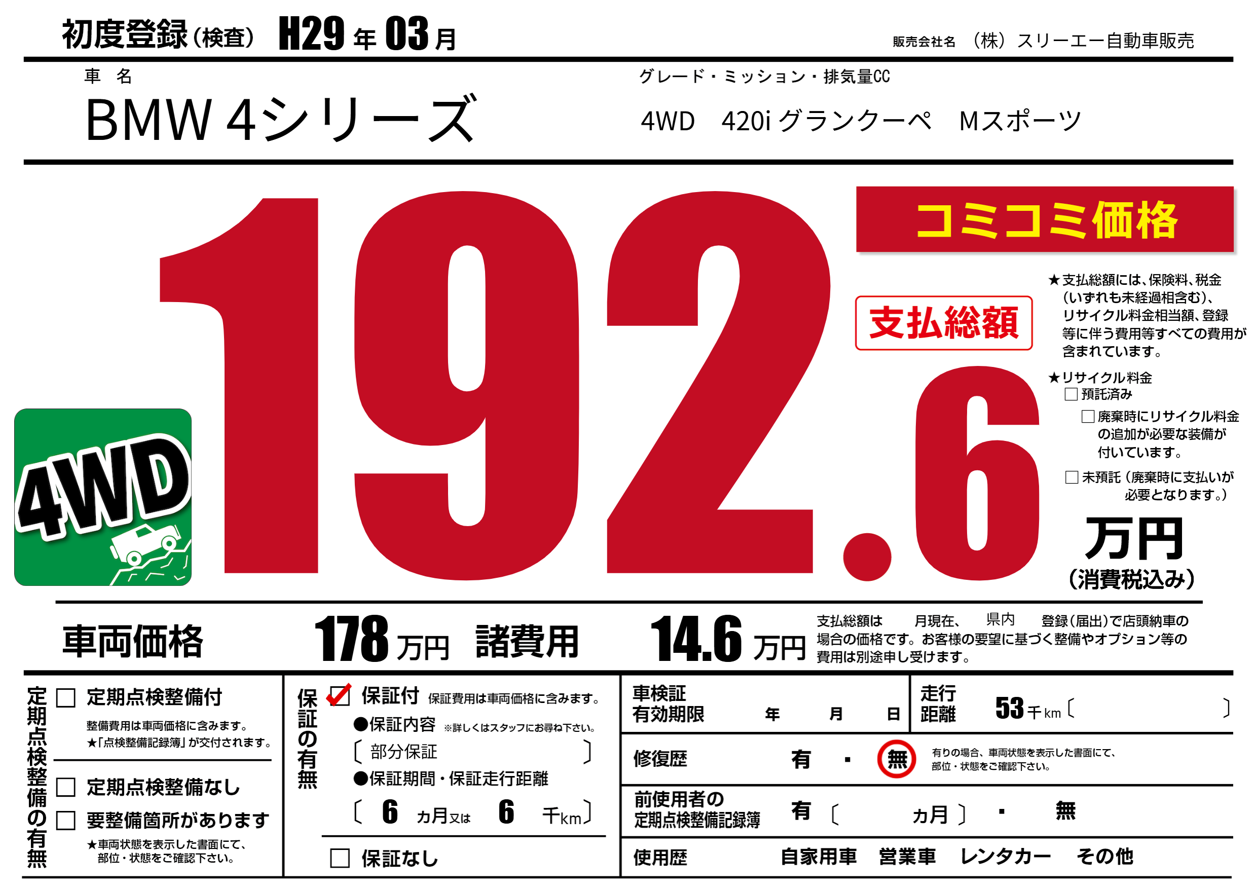 | 車名 | BMW 4シリーズ | グレード ミッション 排気量 |