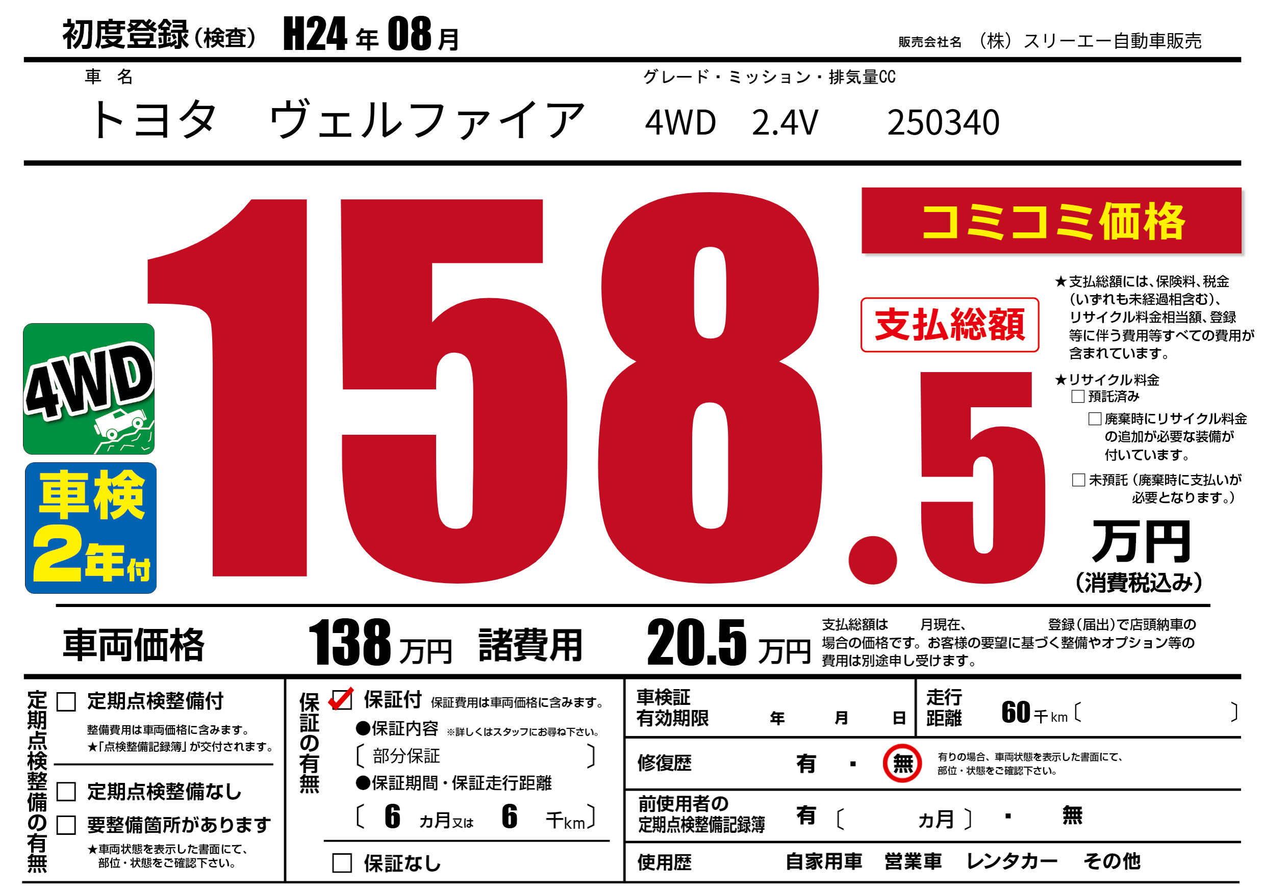 | 車名 | トヨタ ヴェルファイア | グレード ミッション 排気量 |