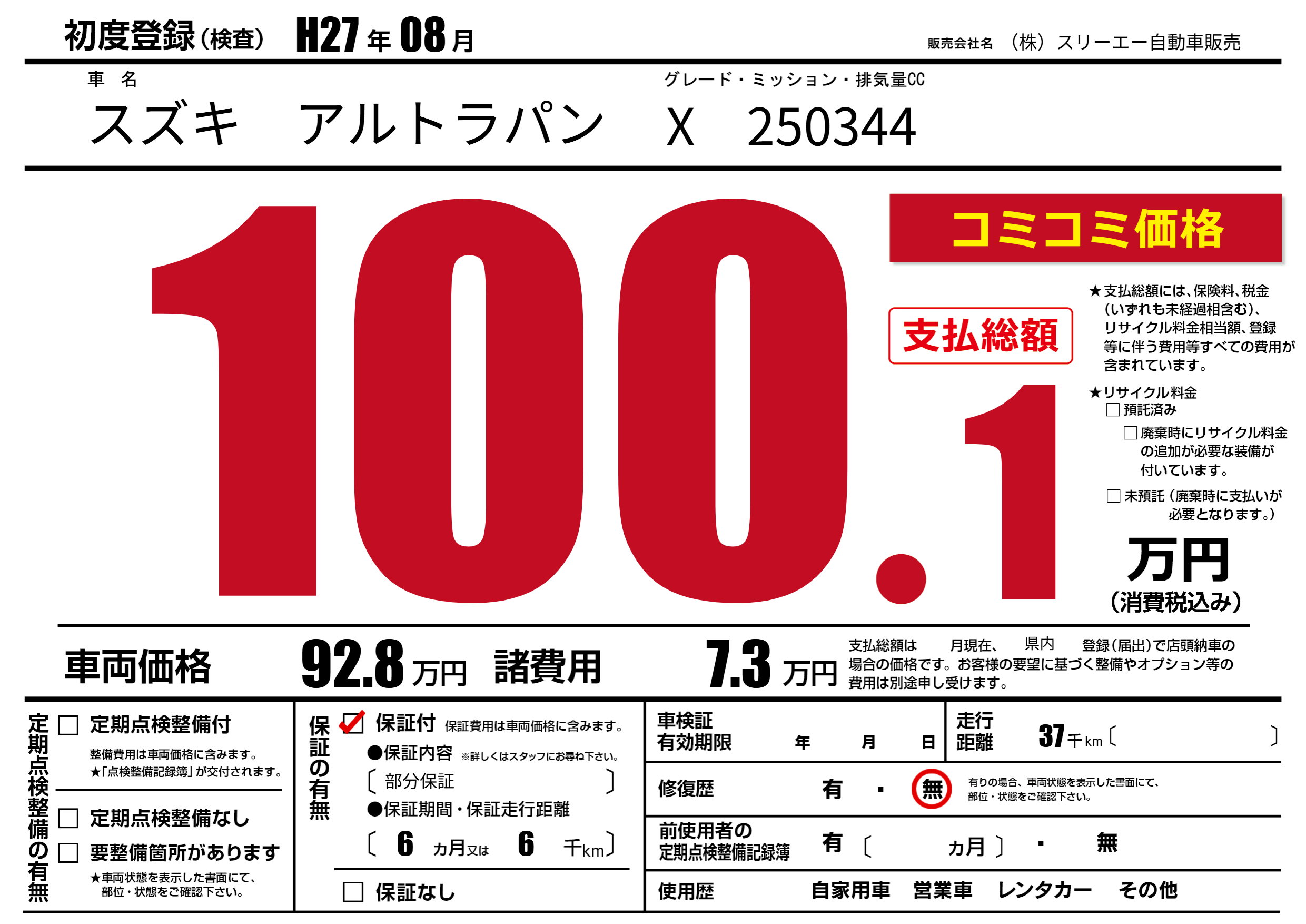 保証付き 保証内容(部分保証) 6ヶ月または(6)千kmまで |