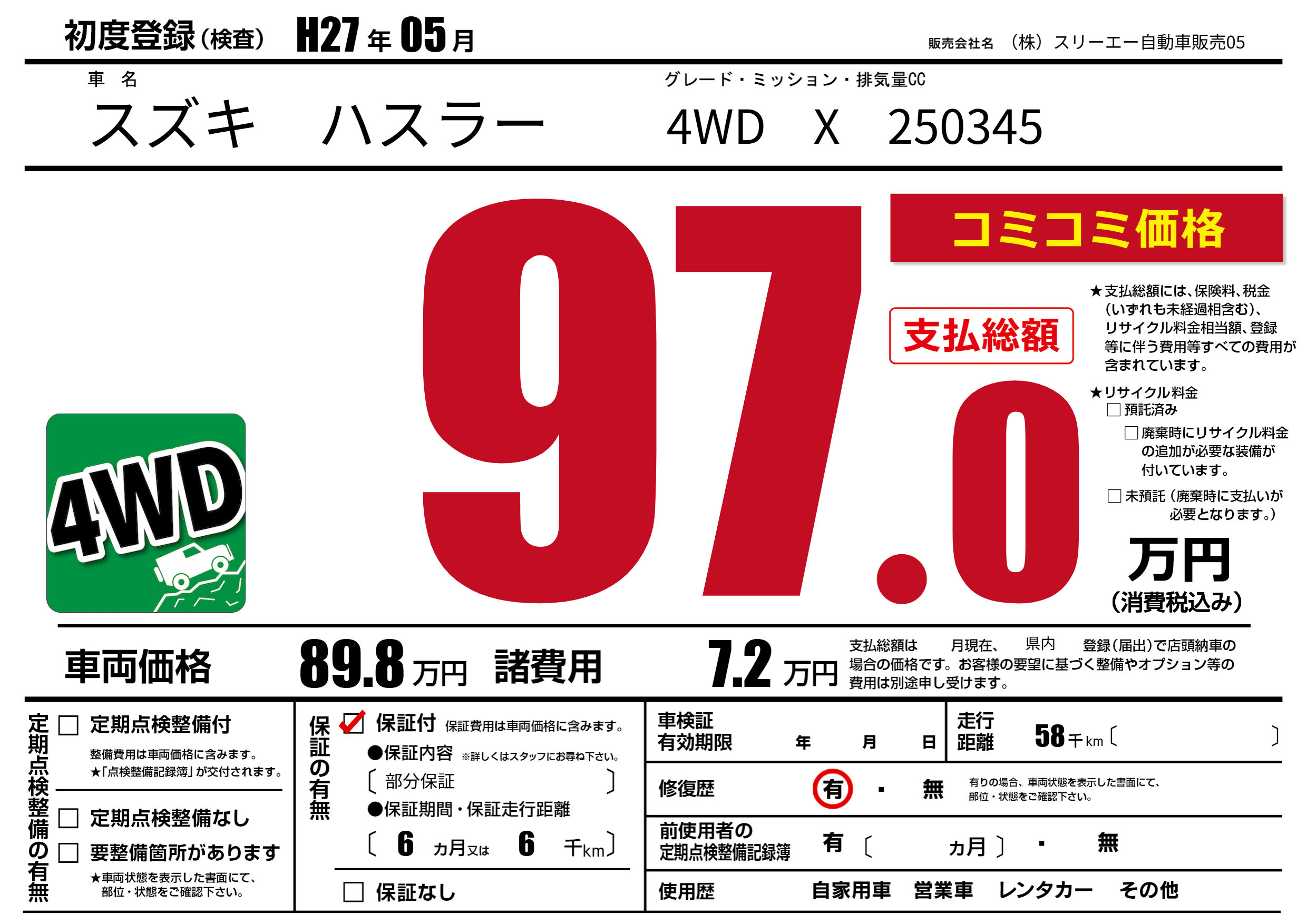 保証付き 保証内容(部分保証) 6ヶ月または(6)千kmまで |