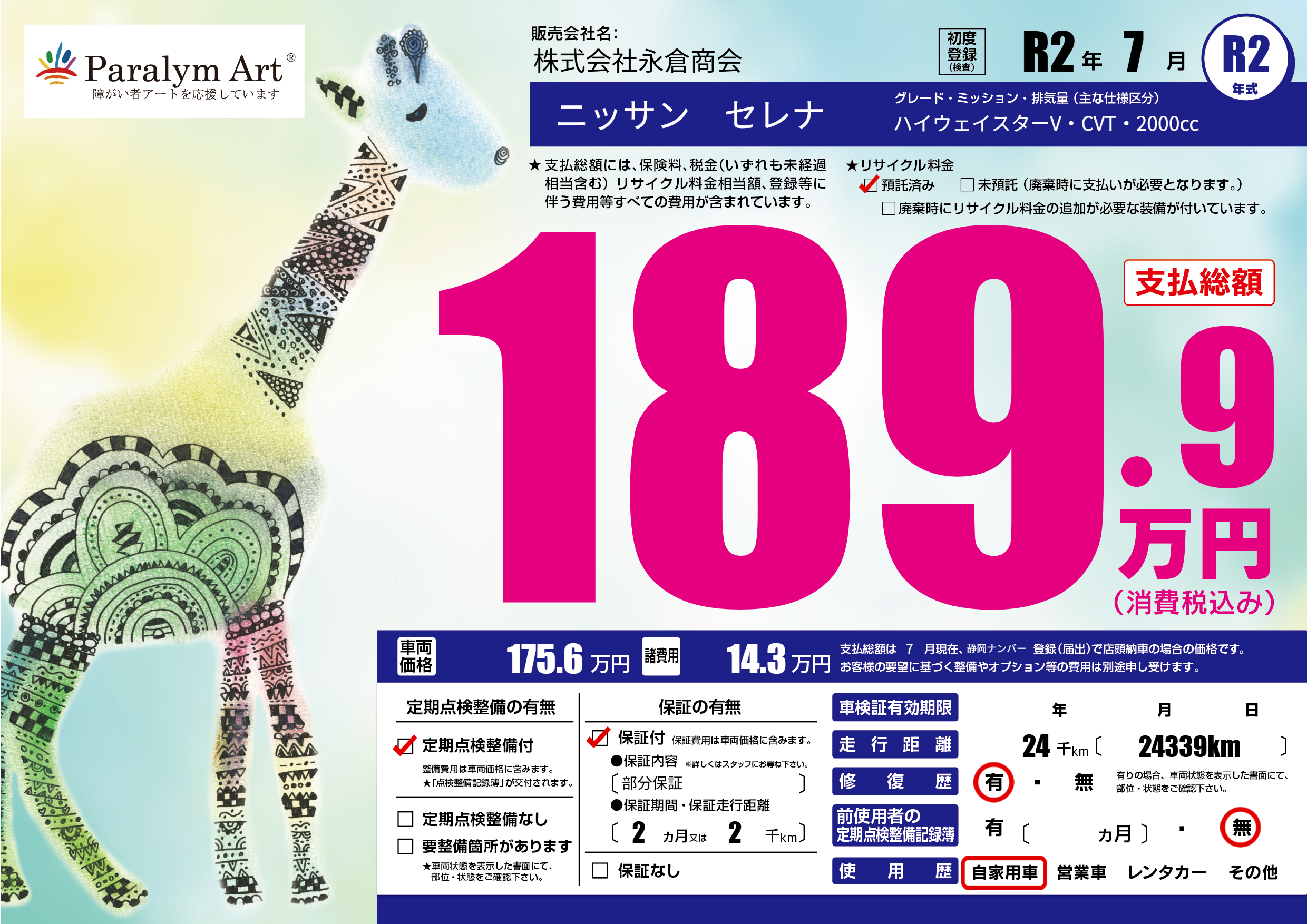 | 走行キロ | 2.4万km | 初年度登録 | R2年7月 |