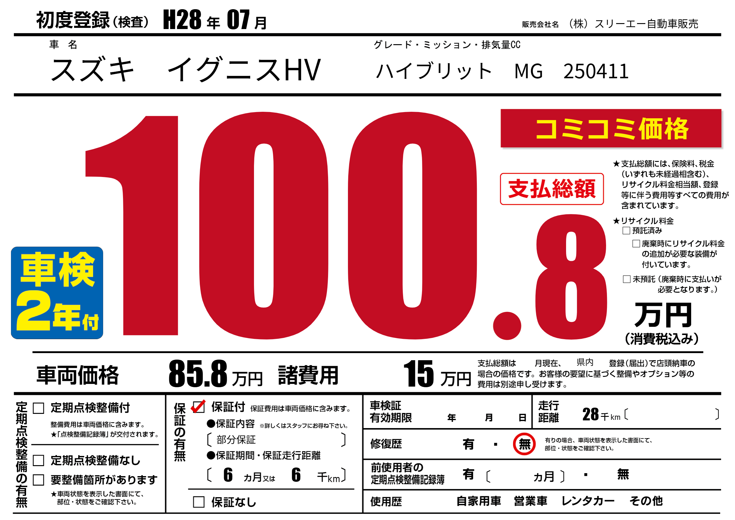 | 走行キロ | 2.8万km | 初年度登録 | H28年07月 |